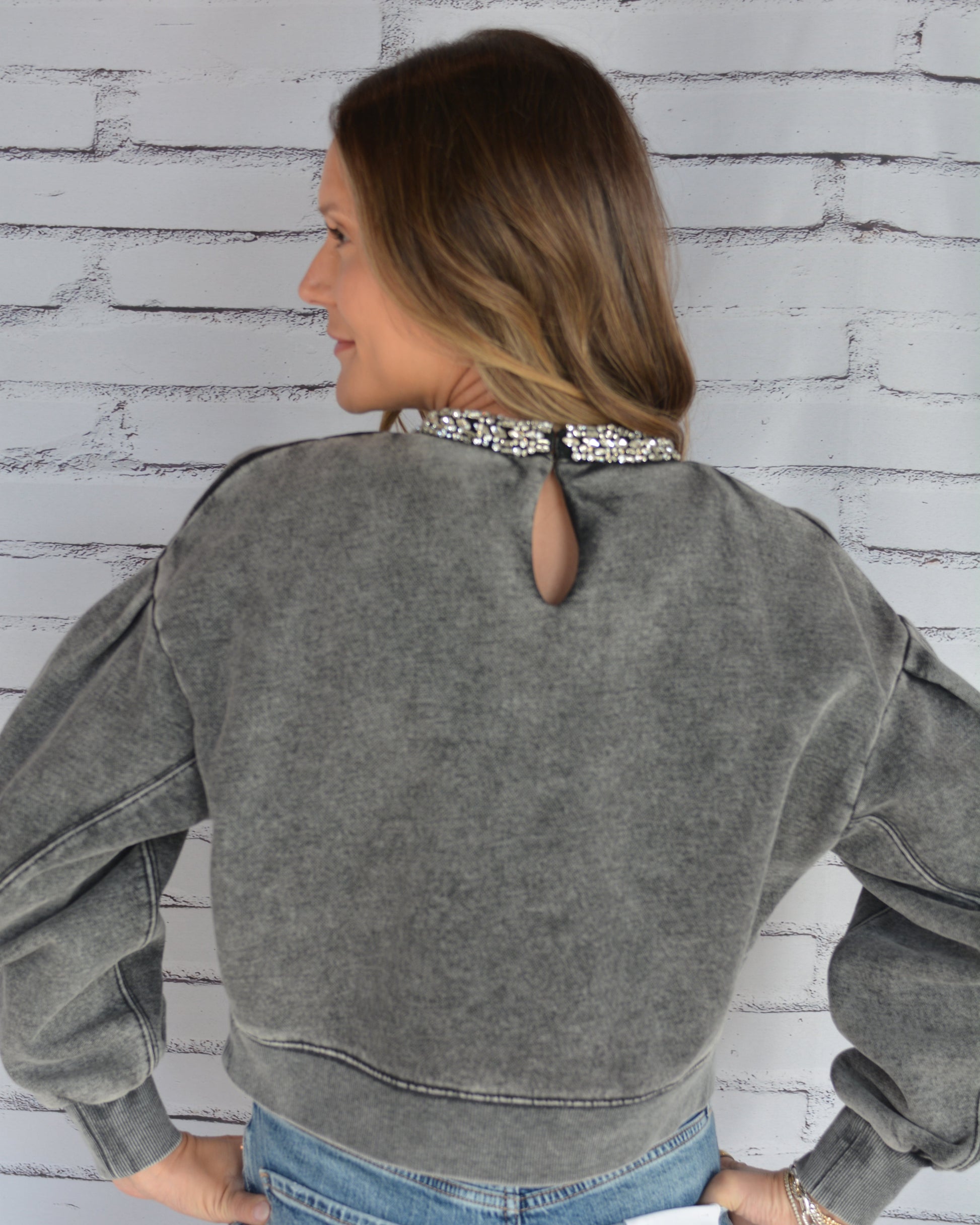 Embrace effortless style with this embellished crewneck sweatshirt in an acid gray wash. Designed for casual days with a refined touch, it features subtle detailing along the neckline that adds a hint of sparkle without overpowering the look. The relaxed fit and soft fabric make it perfect for layering or wearing on its own. Pair it with denim, joggers, or a sleek skirt for a laid-back yet polished ensemble that transitions seamlessly from day to night.