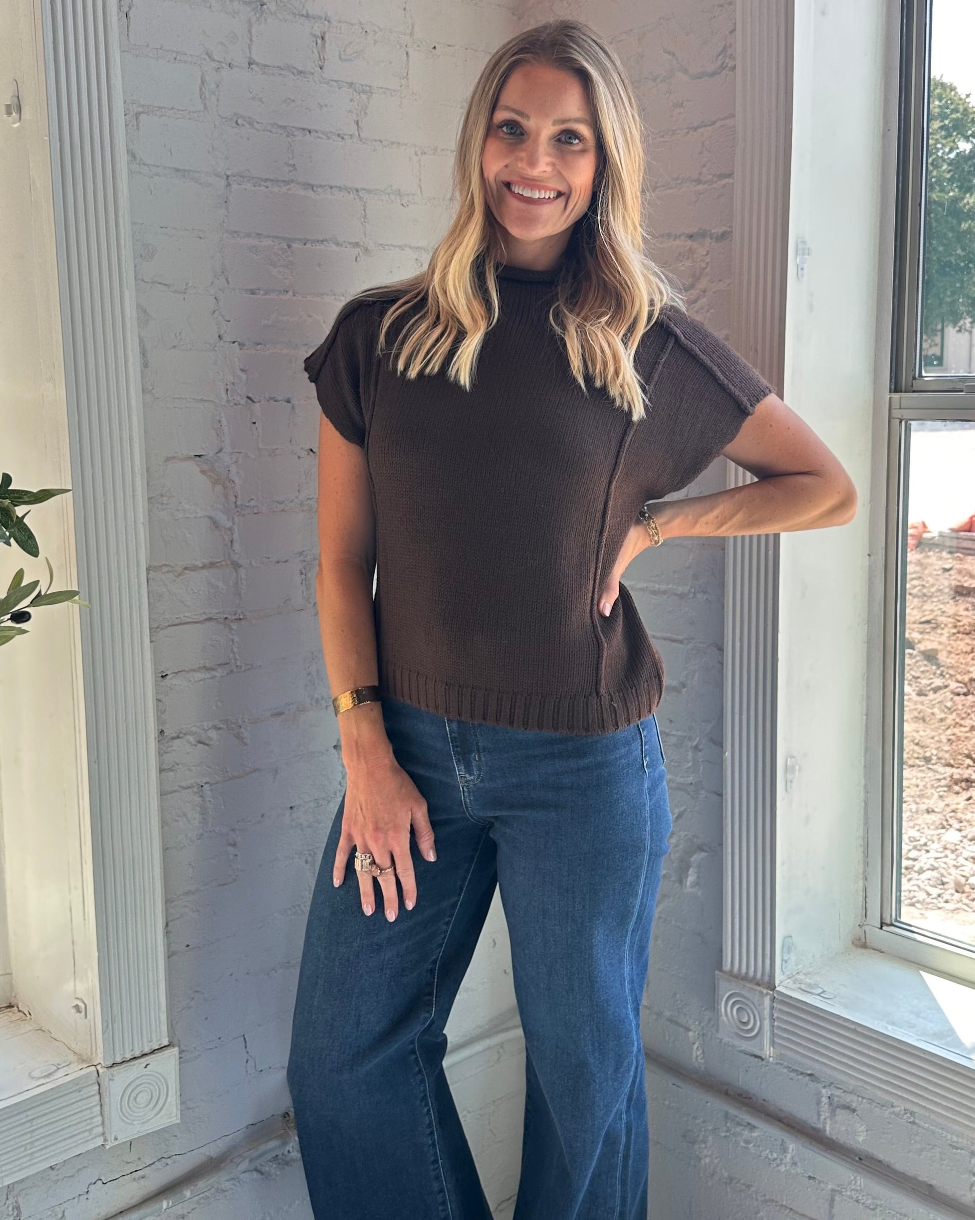 A cozy upgrade to your everyday basics—this crew sweater with cap sleeves features a relaxed fit and soft knit texture. The perfect blend of casual and polished, it pairs effortlessly with trousers, denim, or layered under your favorite jacket.