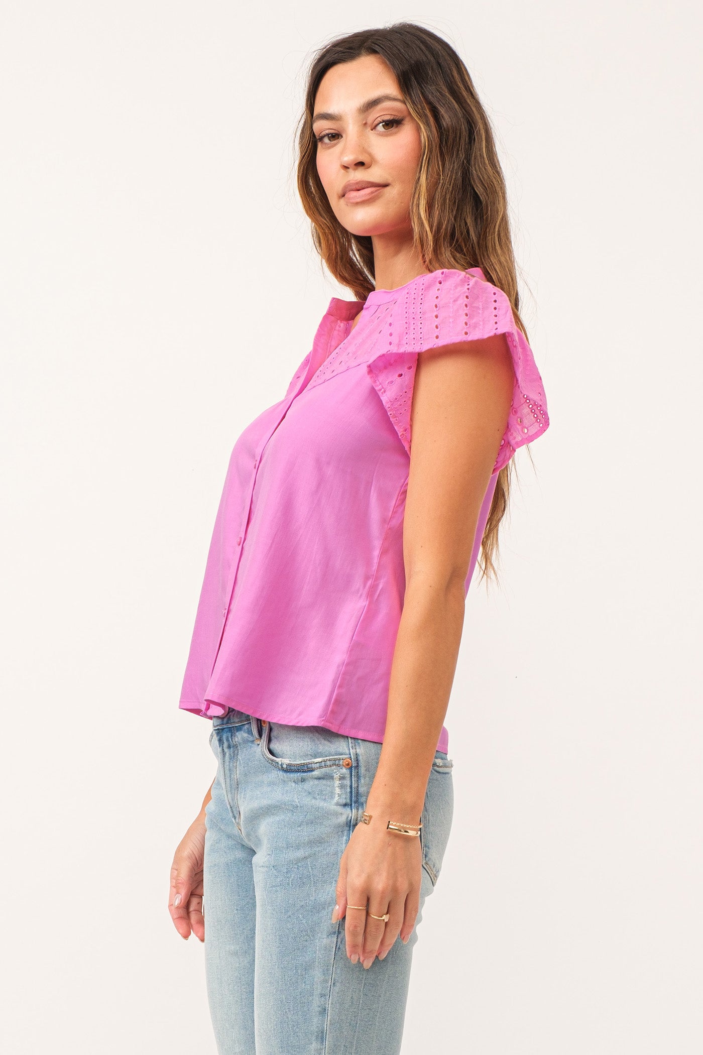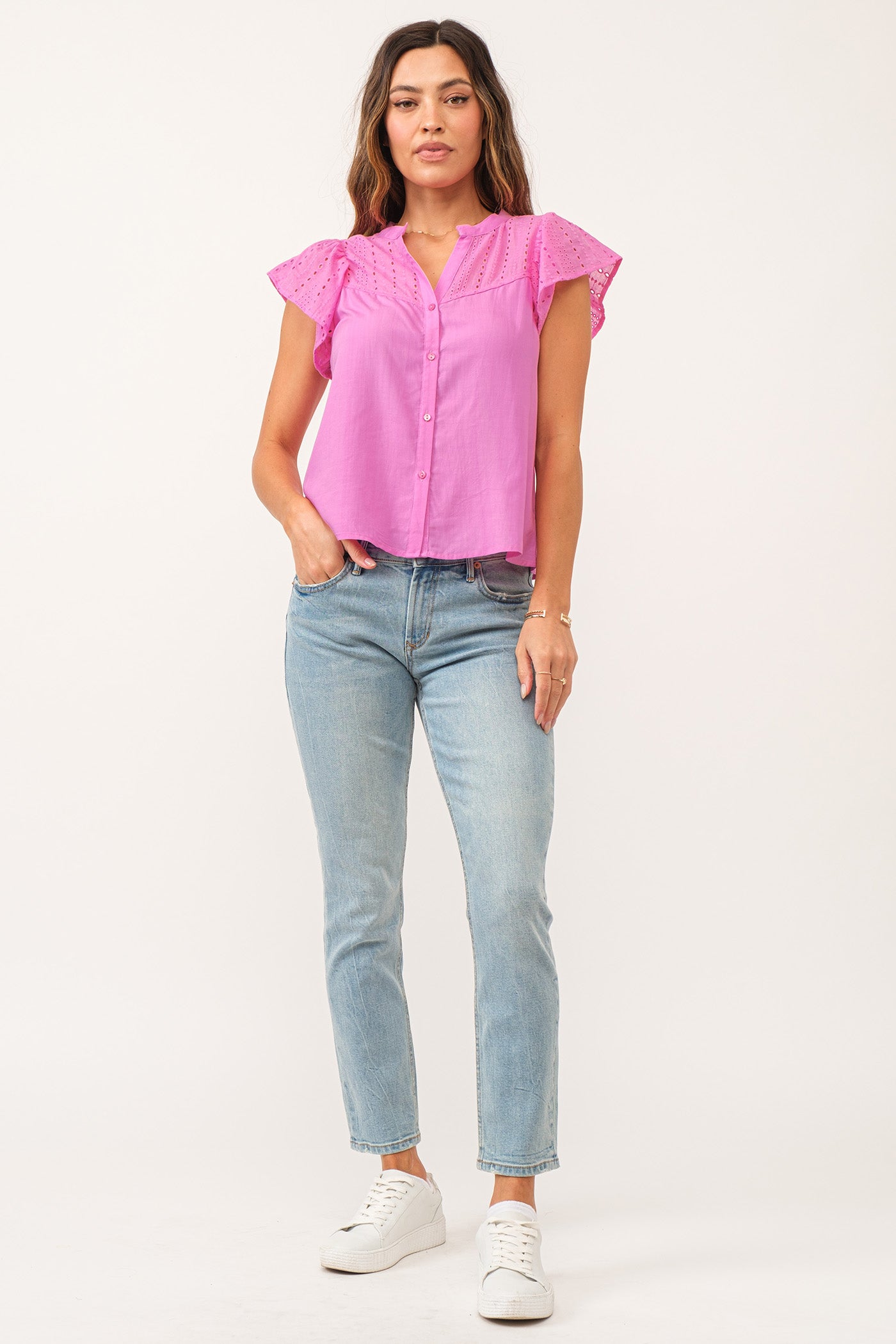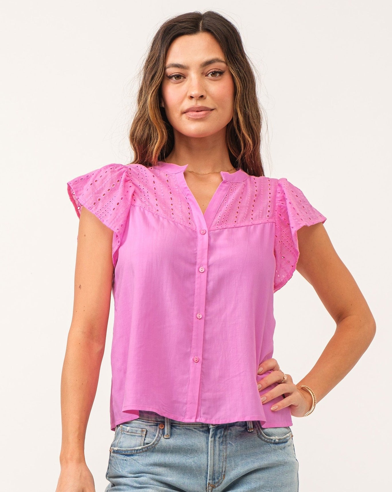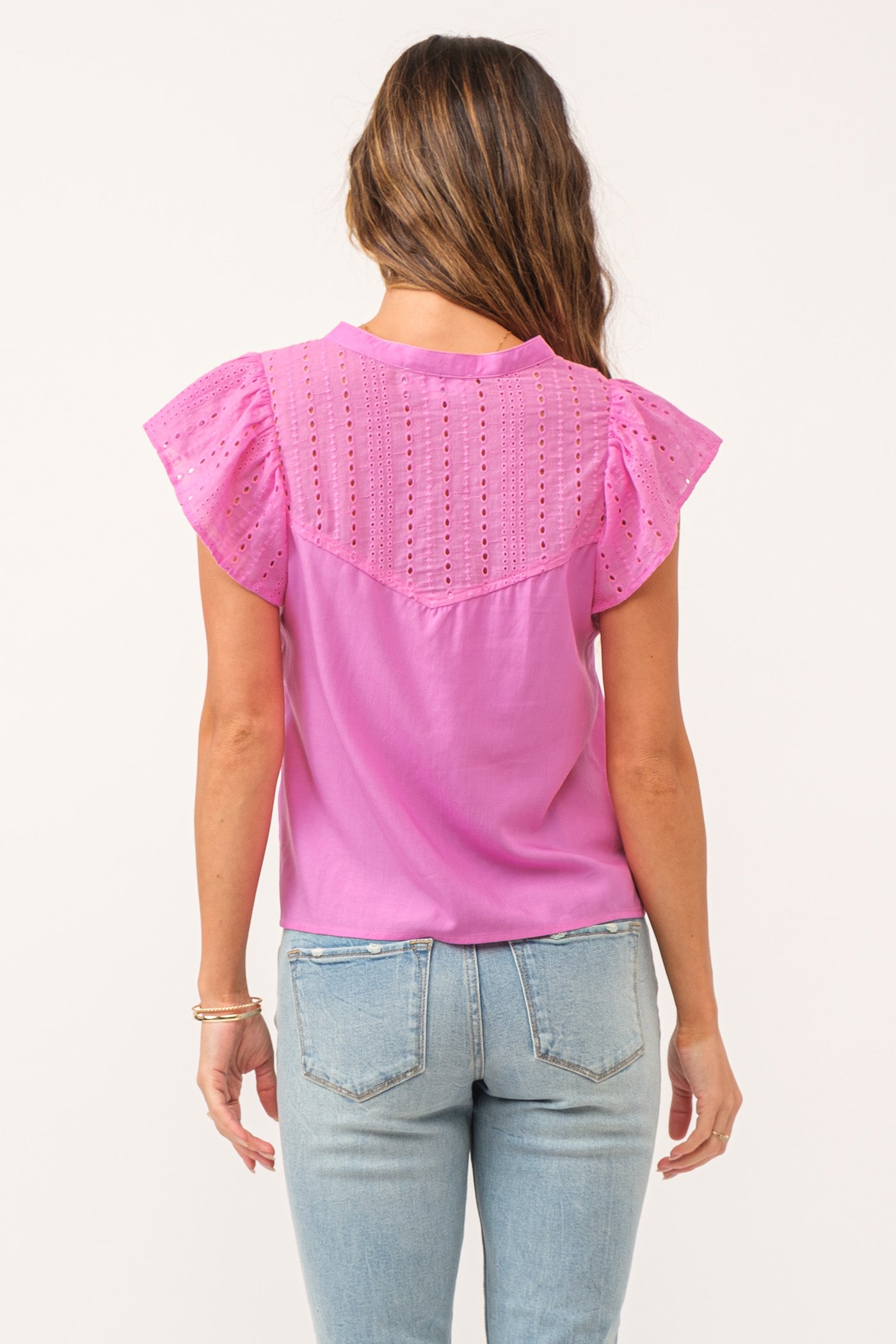 The Amy Top is uniquely designed with eyelet embroidery on the flutter cap sleeves, adding a delicate and decorative touch. The eyelet pattern continues across the shoulder yokes, enhancing its sophisticated appeal!