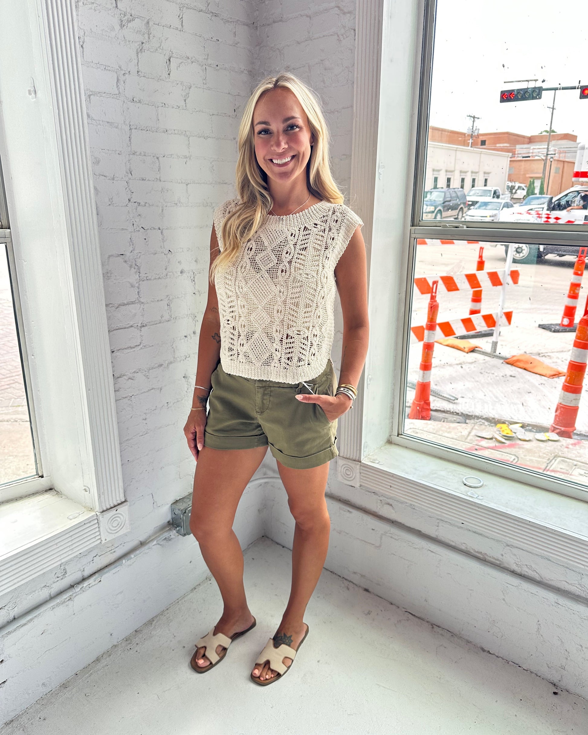 This structured sleeveless sweater is knit in an airy, engineered crochet pattern with a crew neckline and a softly rounded hem. The relaxed fit and open stitch work give it a breezy, modern feel you’ll keep reaching for.