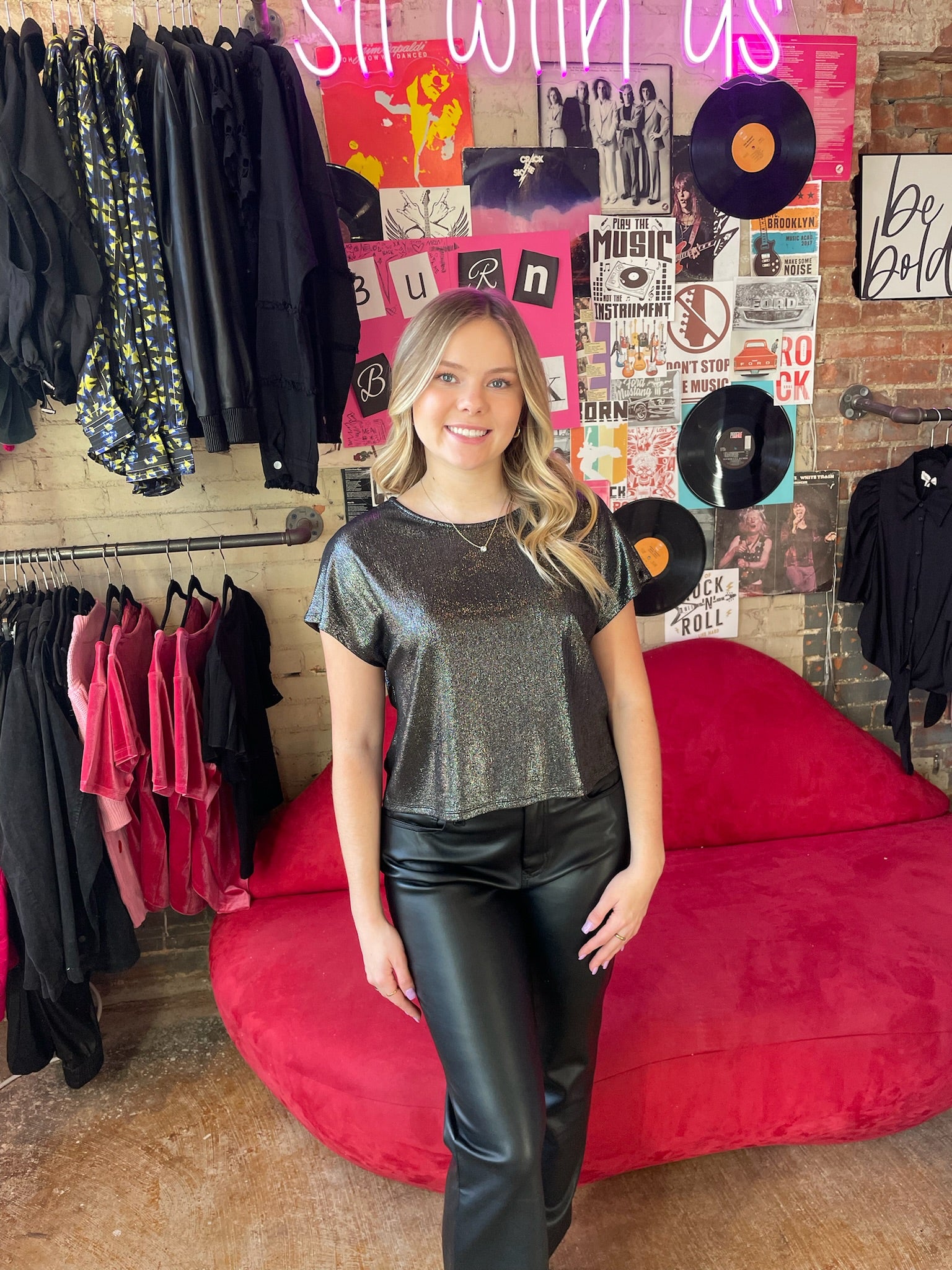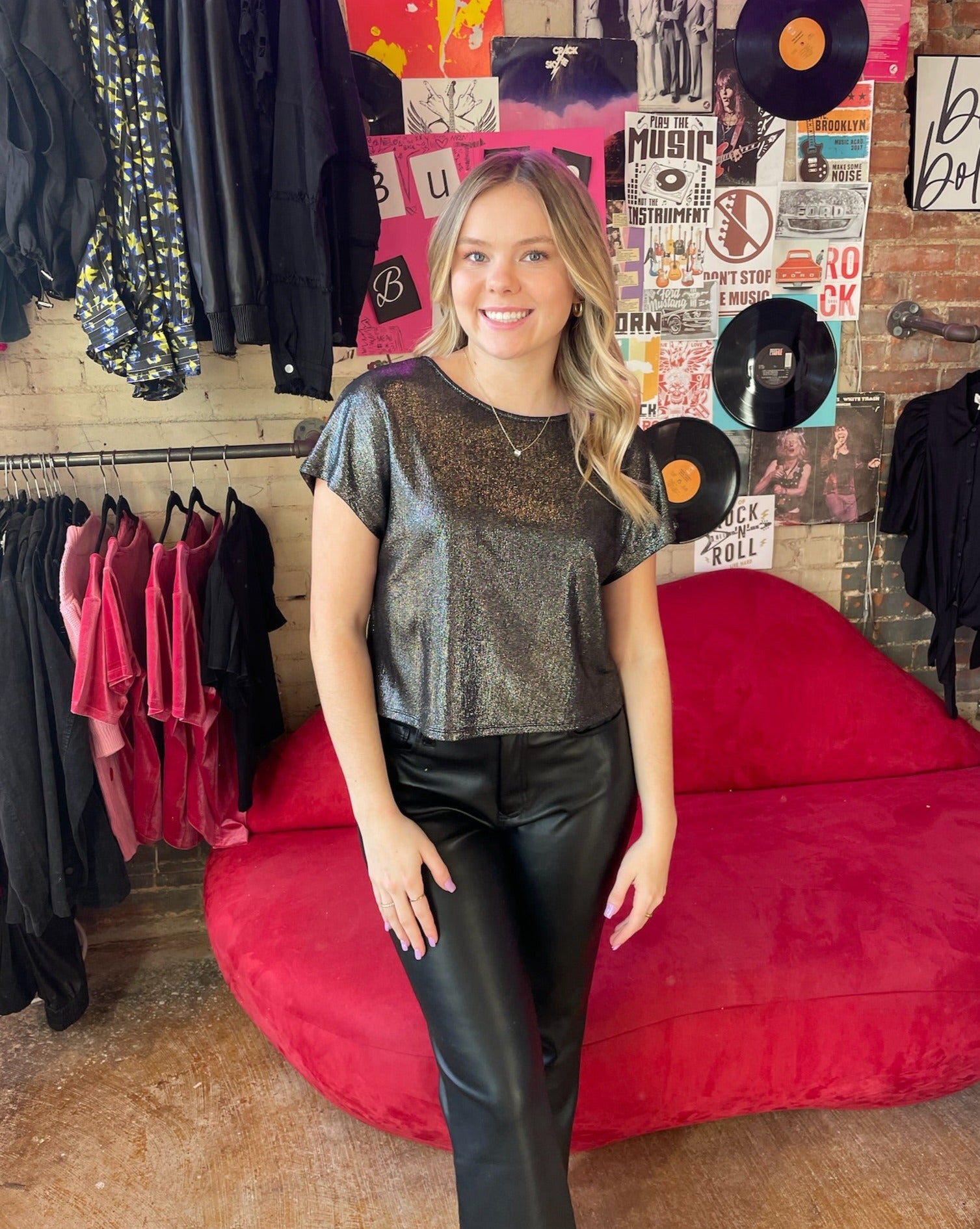 This Tee is the perfect way to add pop to your outfit! This Sparkle Tee features a scoop neckline and short sleeves.