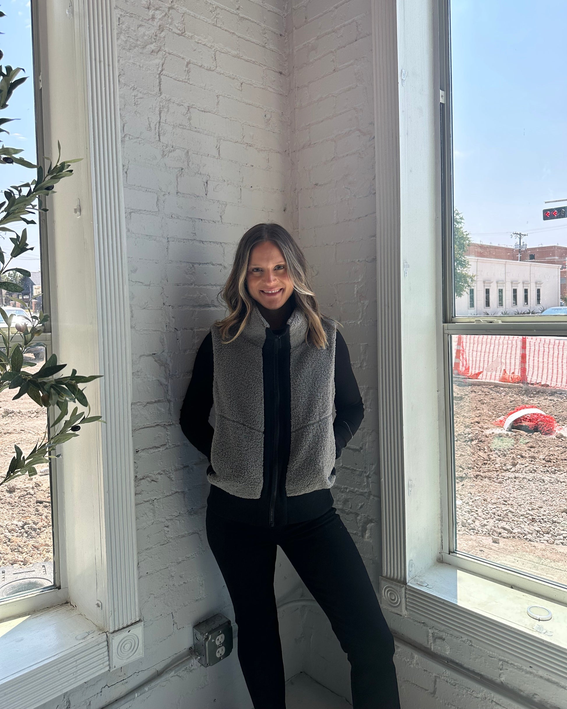 Cozy meets cool in this zip-up sherpa vest. Featuring a soft, textured fleece front, high collar, and sleek ribbed sides for a flattering fit—perfect for layering on chill days or adding an edge to your casual look.