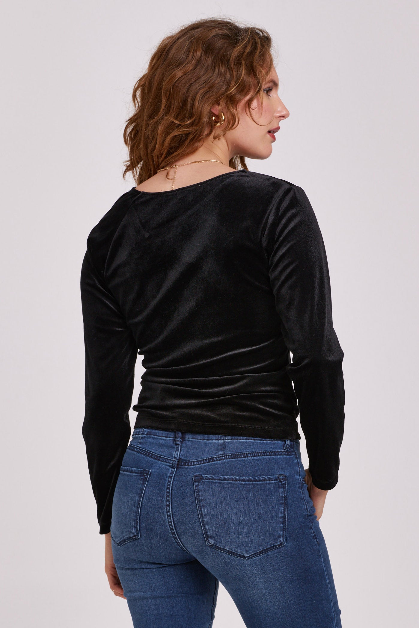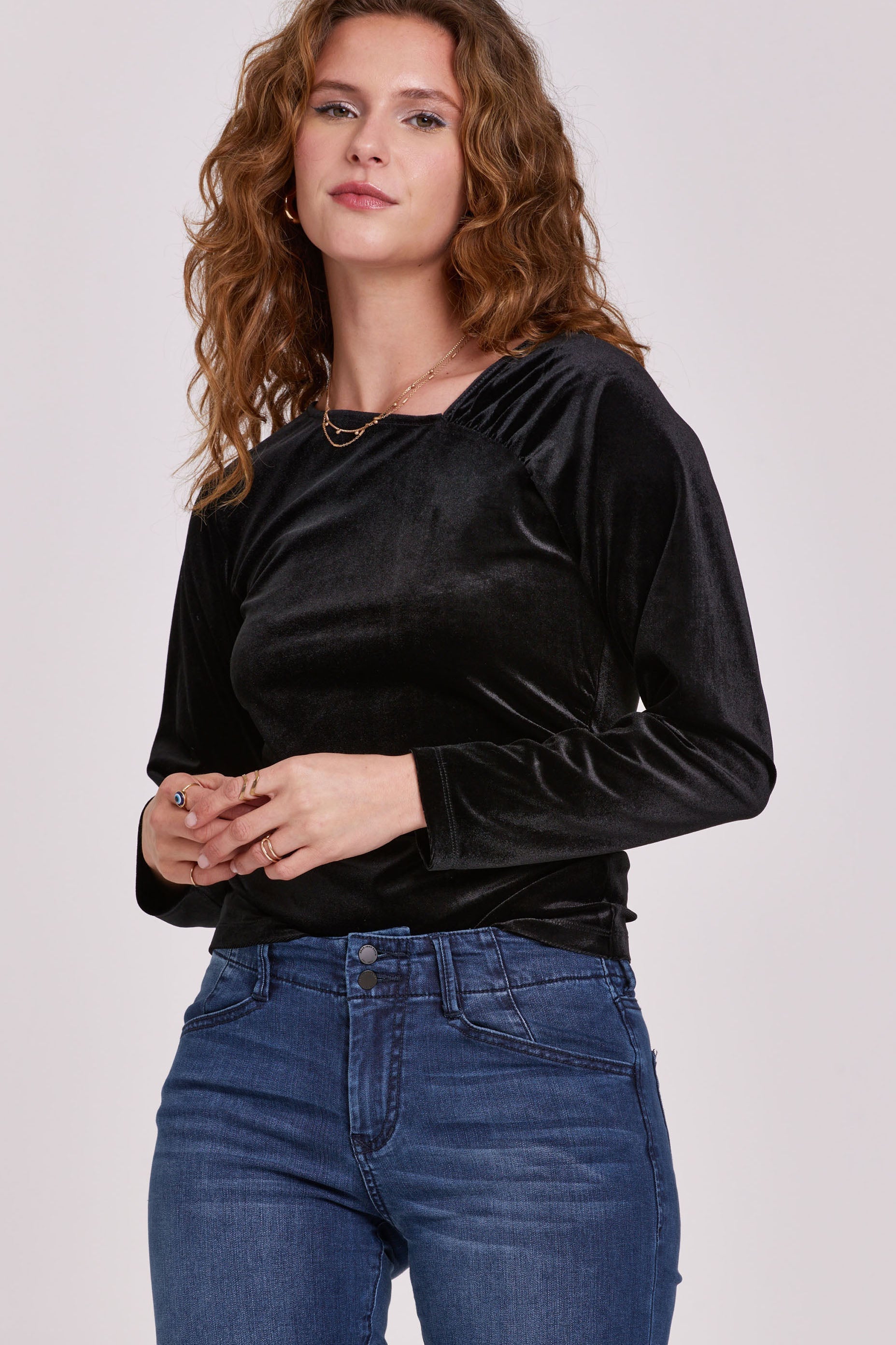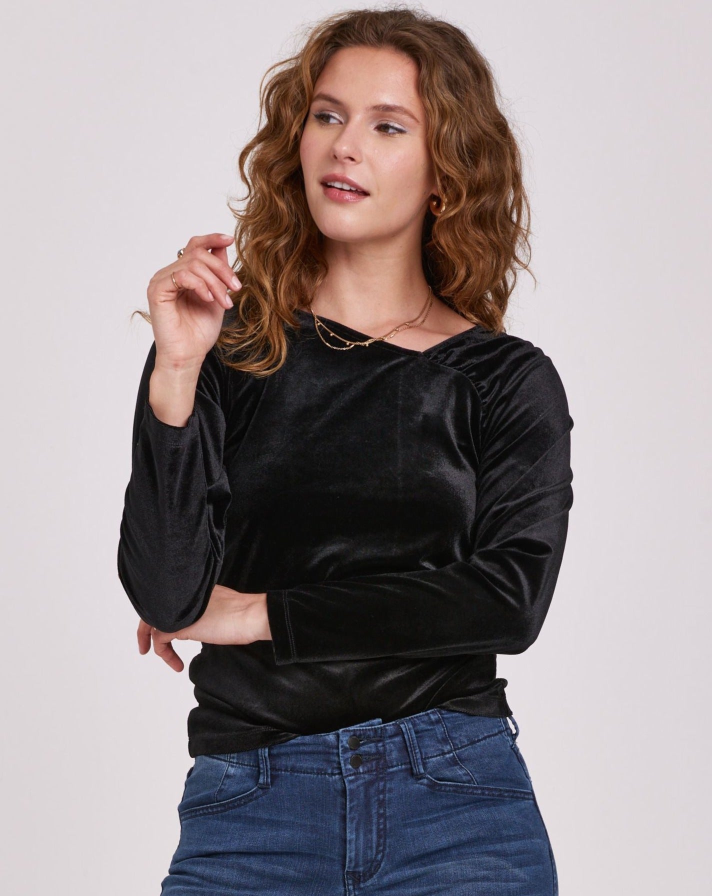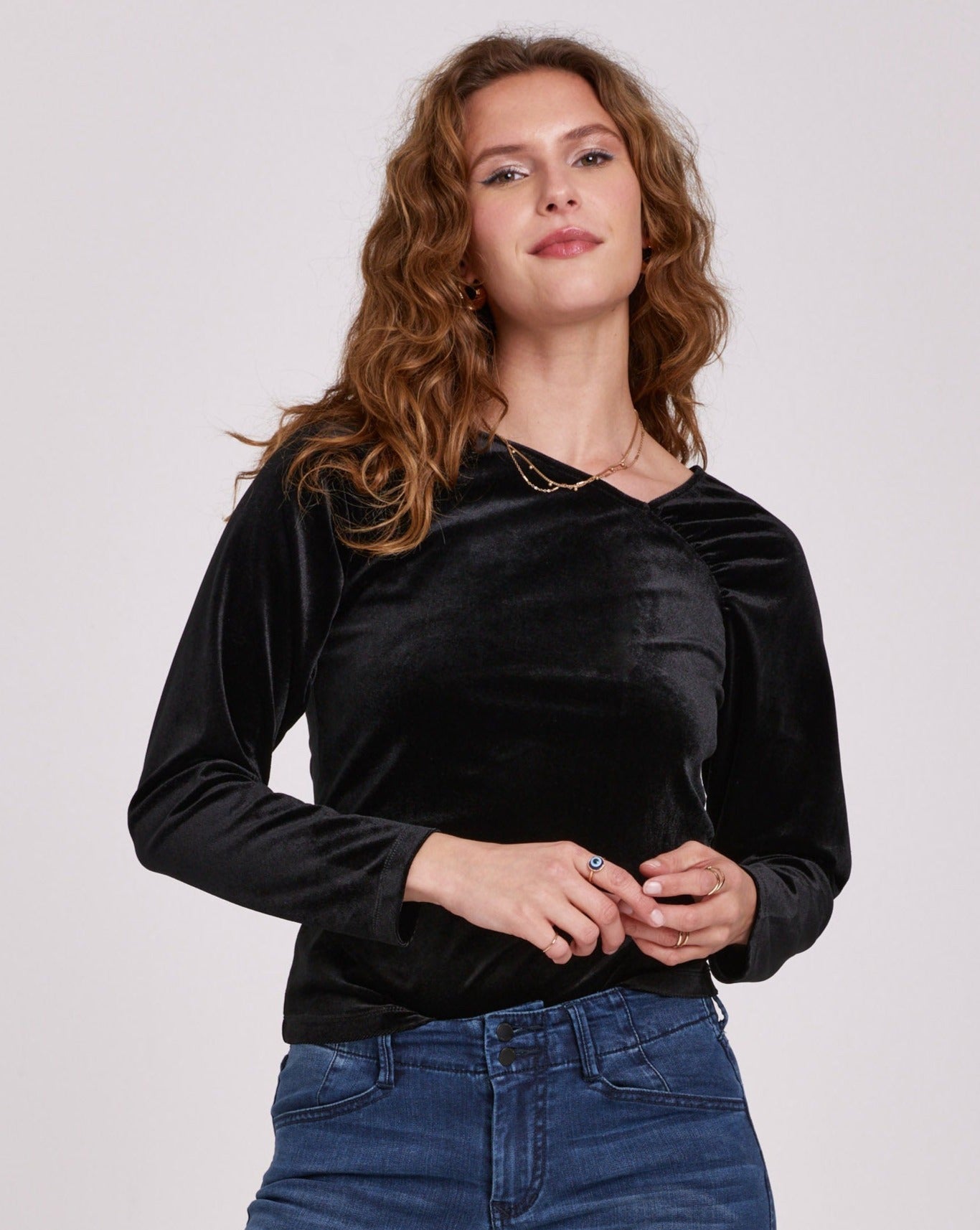 Angled neckline top, long sleeve finished with shirred asymmetrical shoulder seam in velvety luxe & shine! Dress up or casual, looking ever regal while pampered. The versatile piece of sheen for the soulful you! Solid color woven on standard fit.