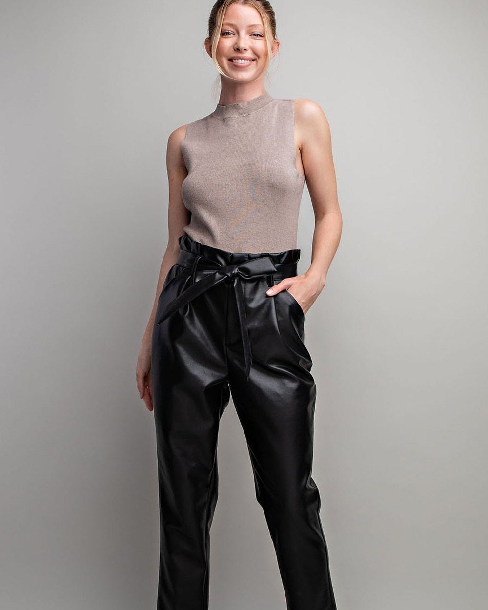 Classy fitted tank top made in a knit fabric with a mock neck.