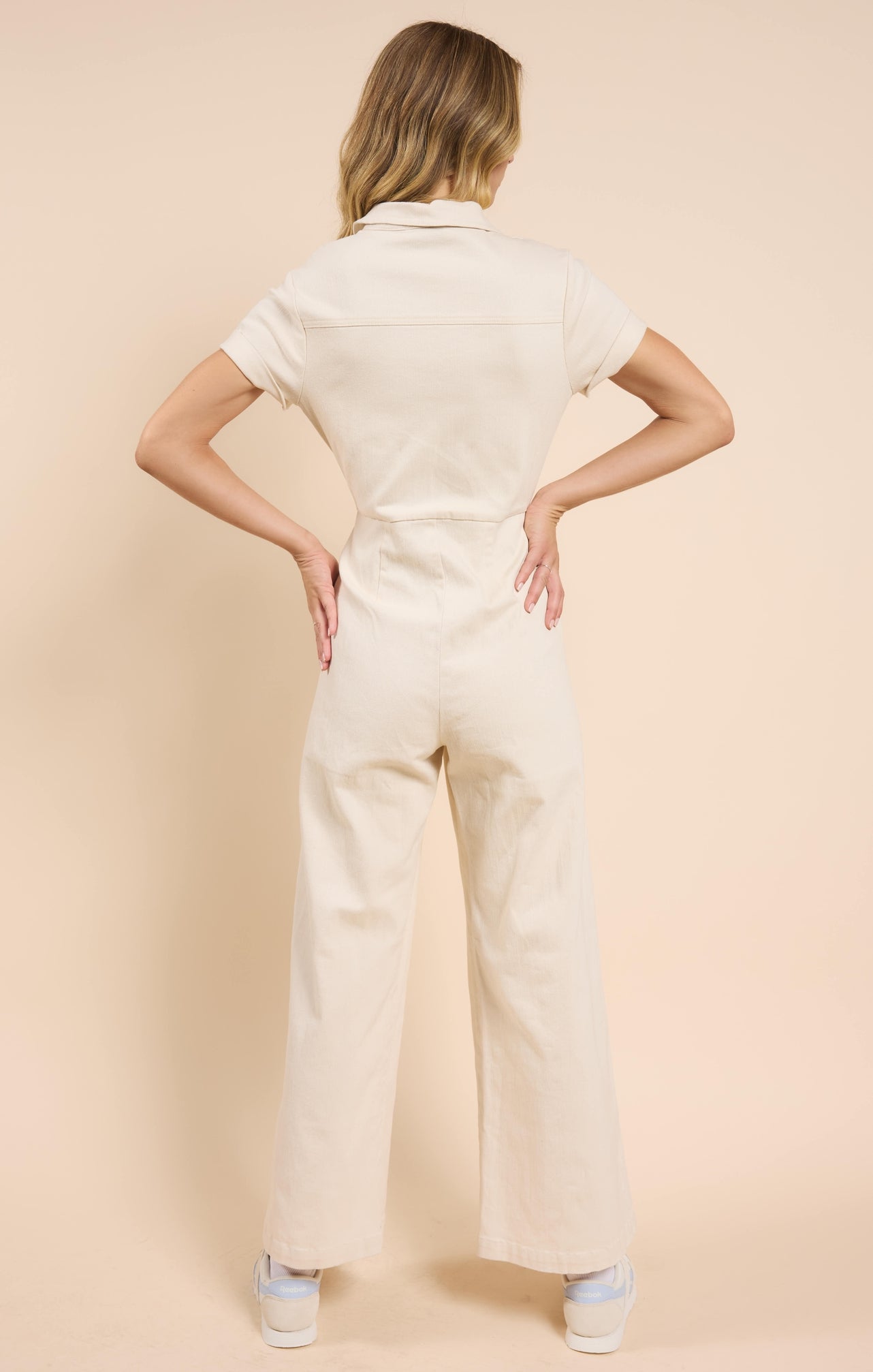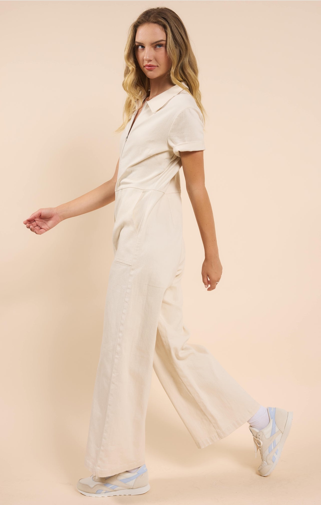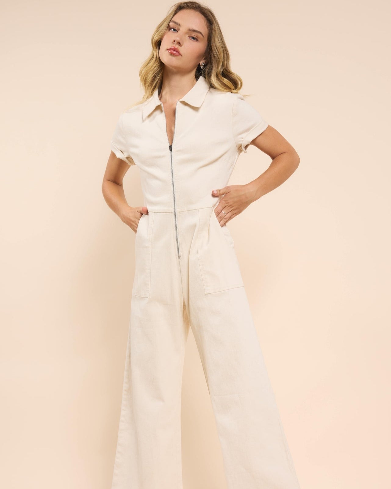 Effortlessly cool and undeniably chic, the Clear Eyes Denim Jumpsuit is your new go-to for a sleek yet relaxed look. Featuring a structured collared neckline, short sleeves, and a bold front zipper closure, this jumpsuit blends utility-inspired details with modern sophistication. The wide-leg silhouette and soft denim fabric ensure comfort and style in one easy outfit.