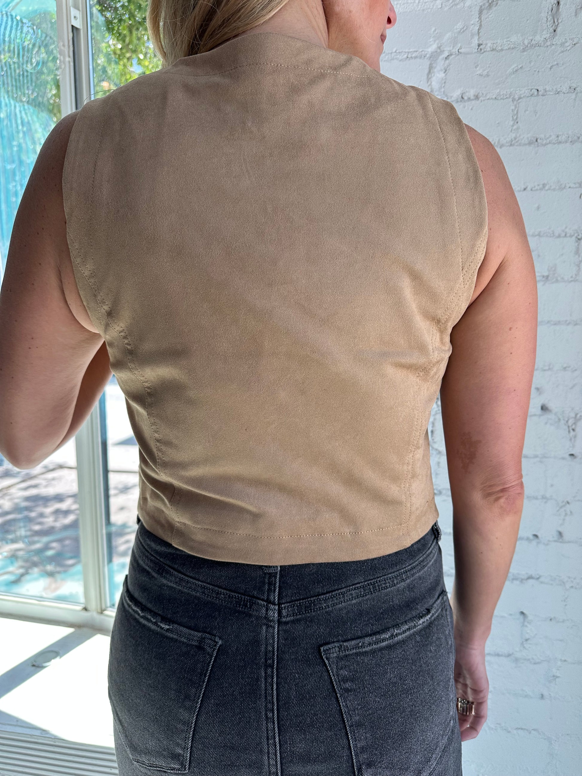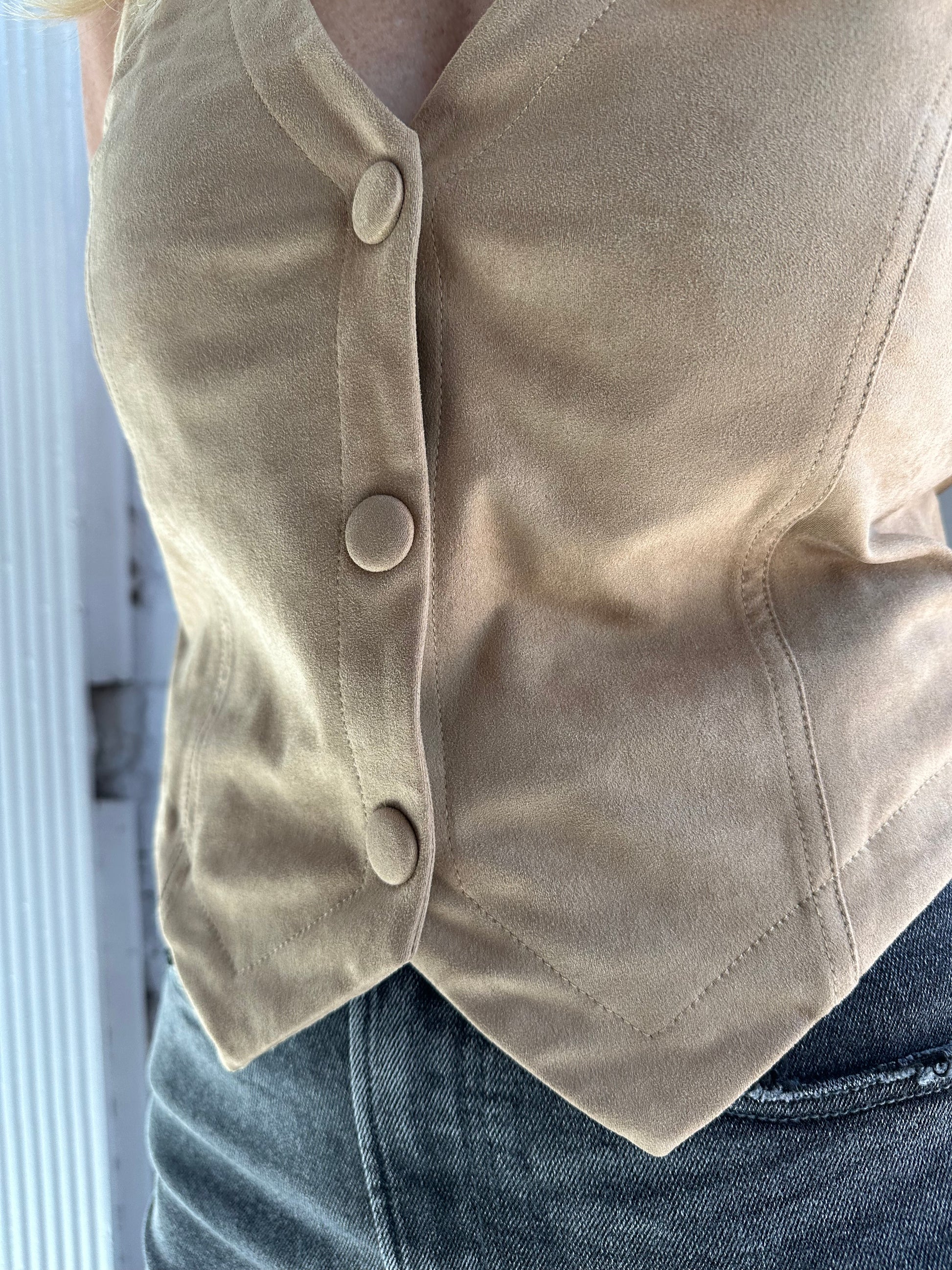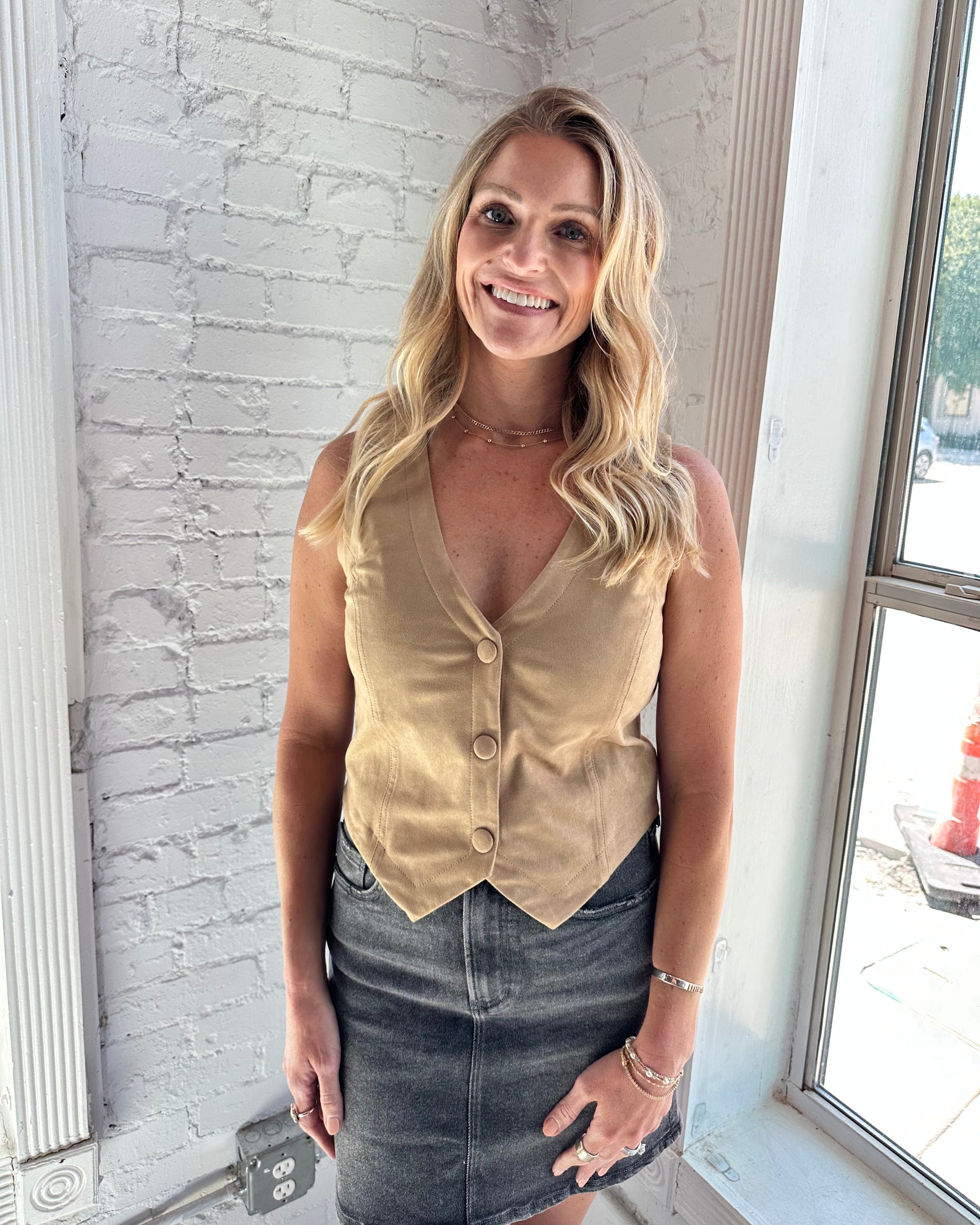 The Drea Vest in light toffee suede is your new layering hero. With a snap front for easy style and a fitted cut that flatters every look, its perfect worn solo, over a shirt, or our favorite way—layered over a dress. Add a playful touch to your outfit with this versatile piece!