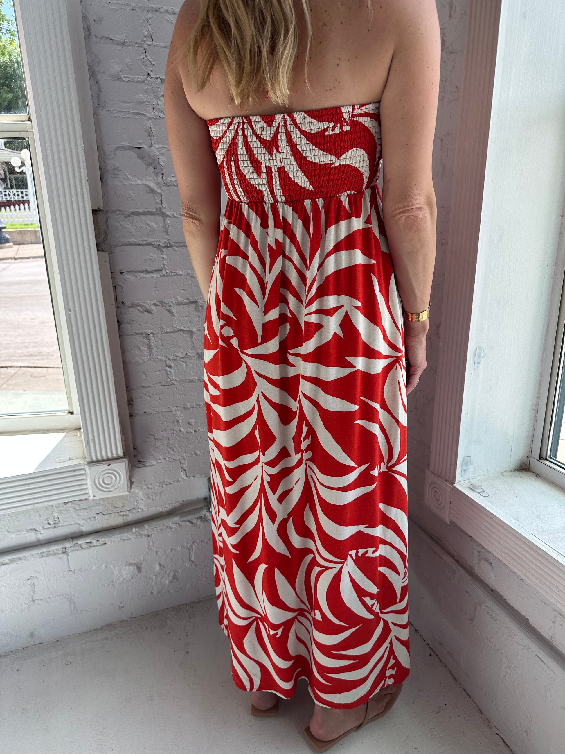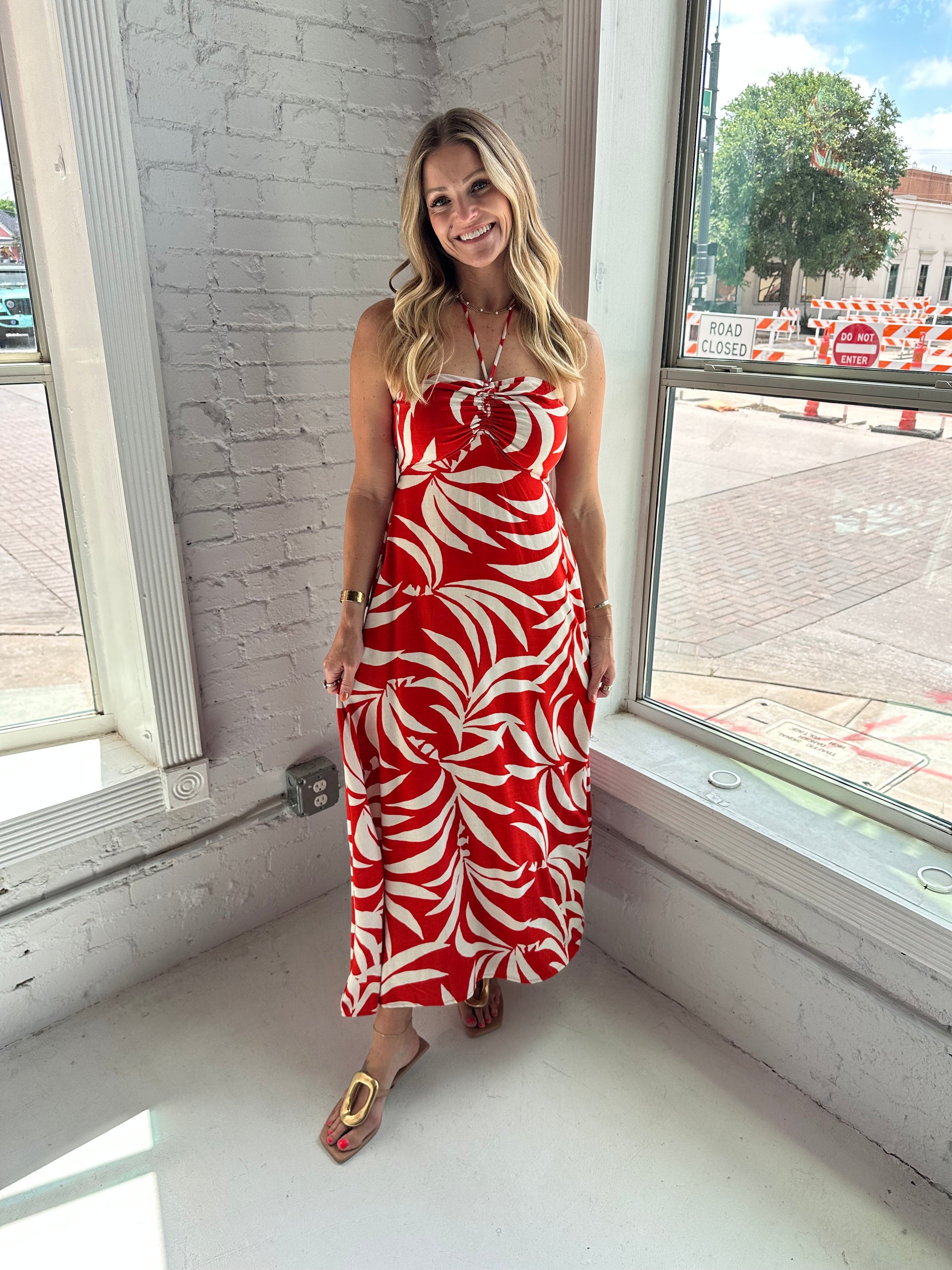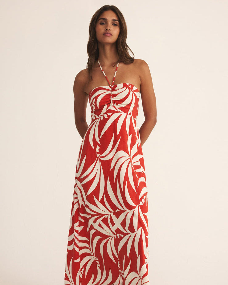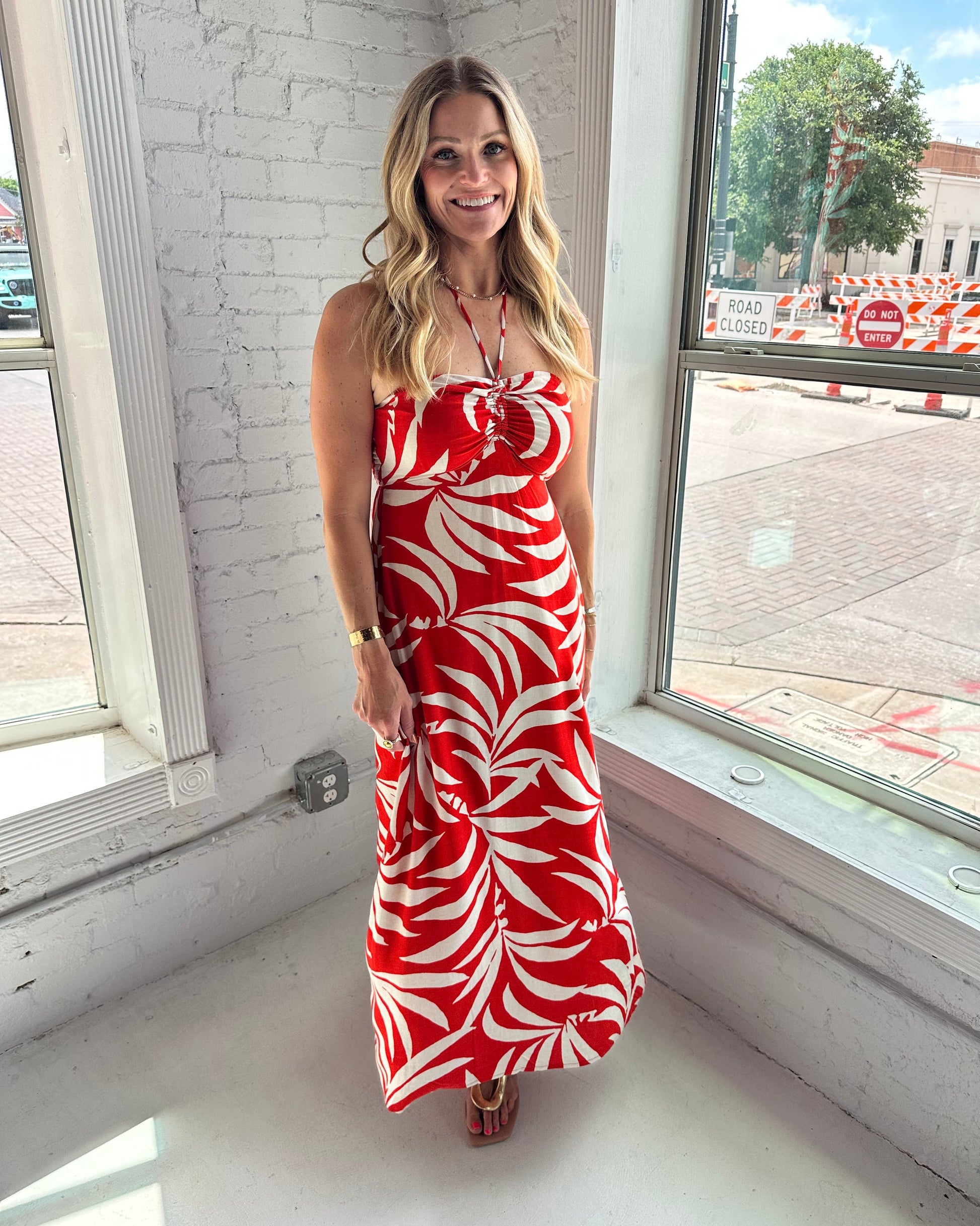 Sun-drenched days call for this tropical-print bandeau halter dress, complete with a center tie and a smocked back for the perfect fit. With a body-skimming silhouette, halter straps, and silicone gripper tape for extra support, it’s made for soaking up the sun in style.