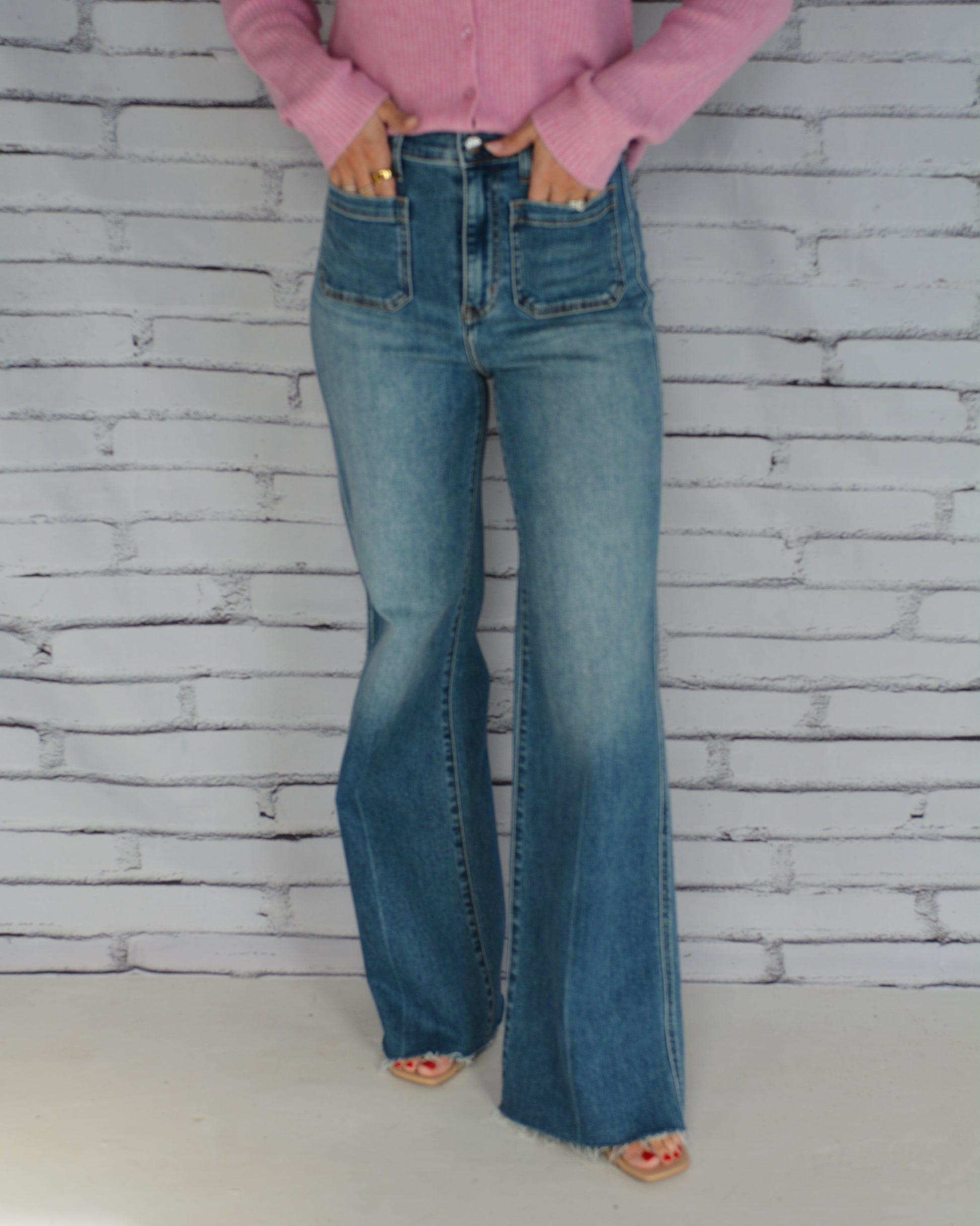 The Far Out jean is a modern, wide-leg silhouette in a trending dark rinse wash with front pockets, offering a cool and sophisticated look. Made from comfort stretch denim with 93% cotton, 5% polyester, and 2% elastane, it features a 12" rise, 32" inseam, and 23 1/2" leg opening. Machine wash cold—saving water with fuller loads.