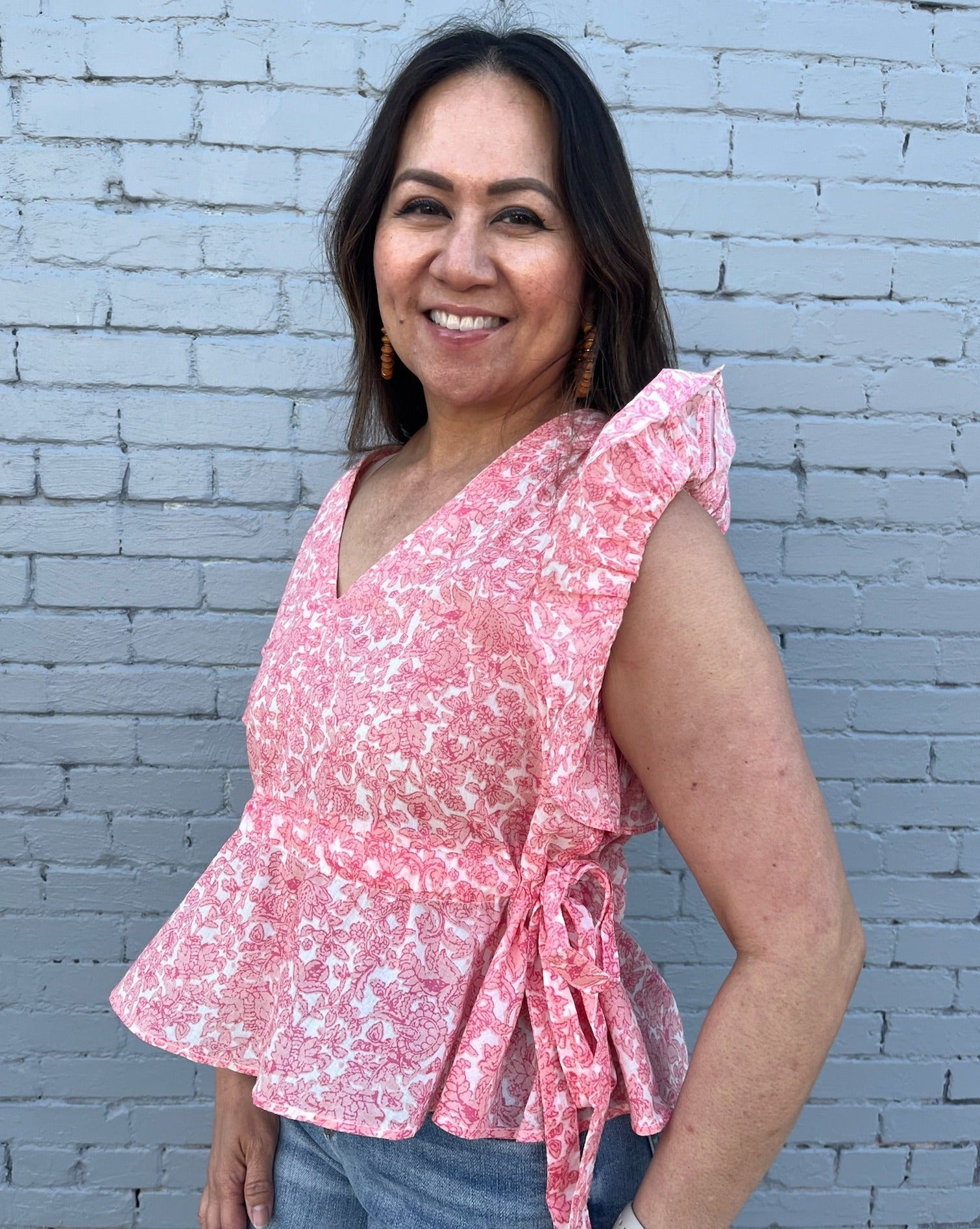 This darling top has so much stunning detail! It features a a v-neckline, flutter sleeves, a tie waist with a built in waistband, and a ruffled bottom! We recommend pairing this with white jeans and some neutral sandals for a cutesy spring look!