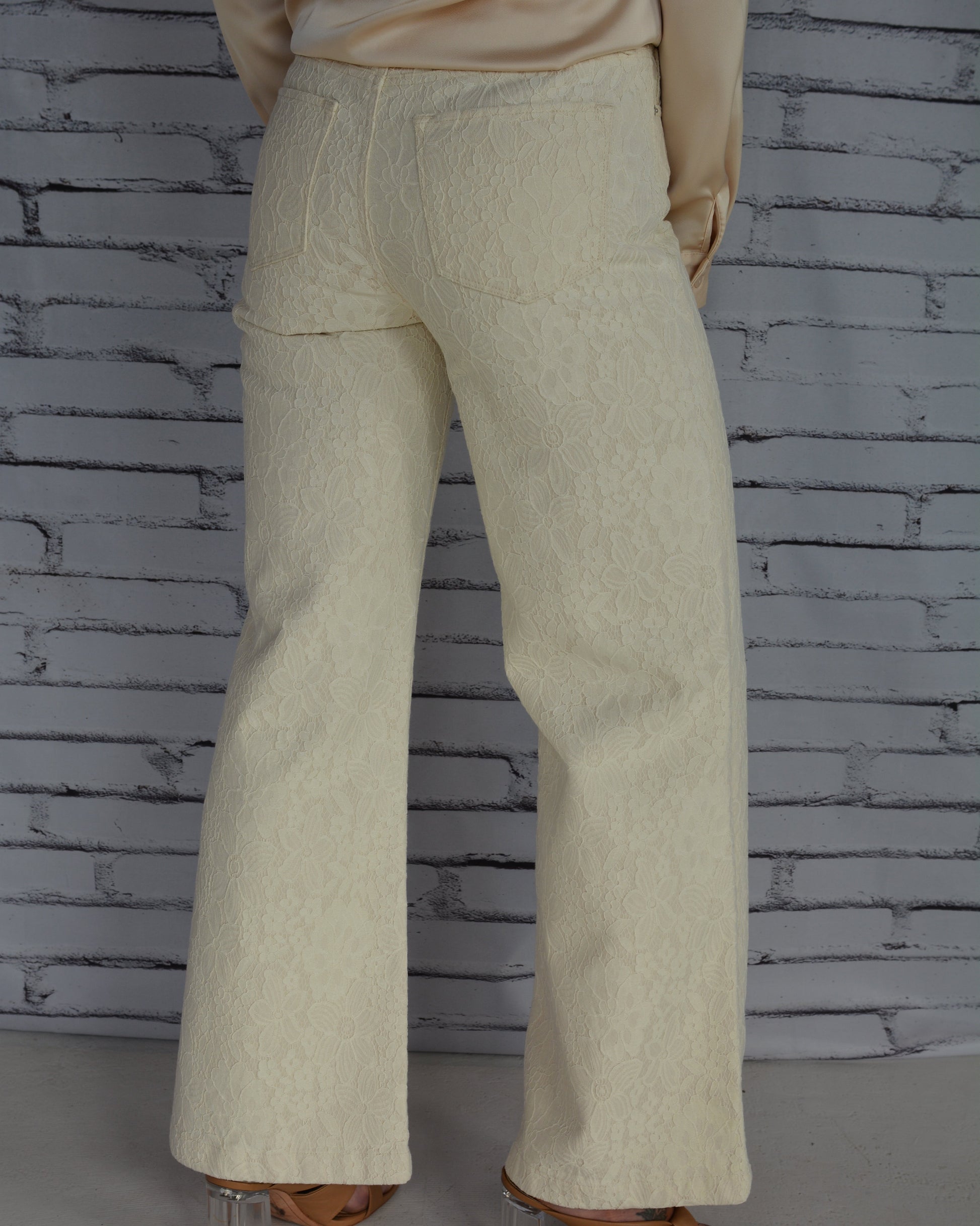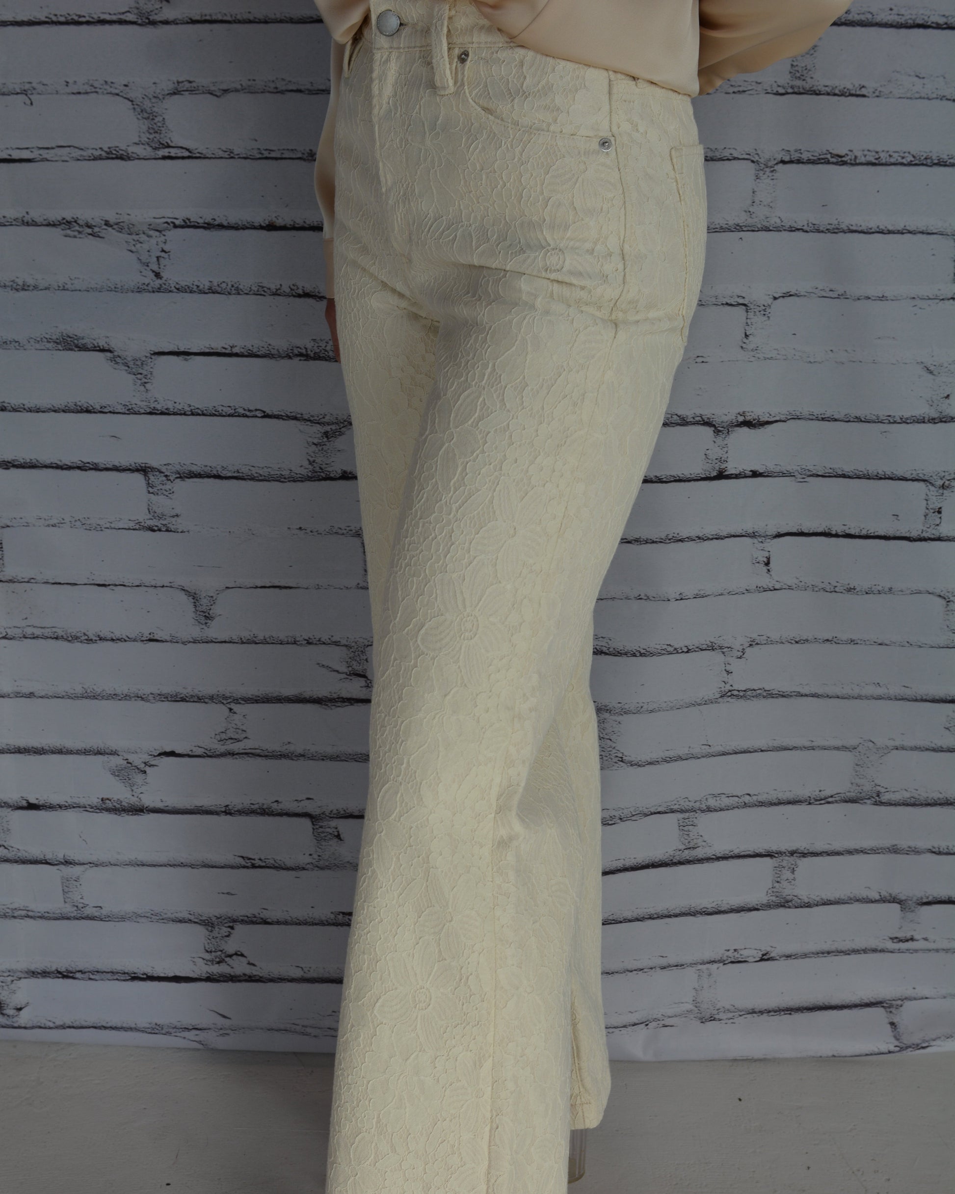 A statement take on classic denim, these jeans feature an intricate lace overlay that adds a soft, feminine touch. Designed with a flattering silhouette and timeless appeal, they balance structured denim with delicate detailing for an elevated look. Perfect for dressing up everyday outfits or styling for special occasions.