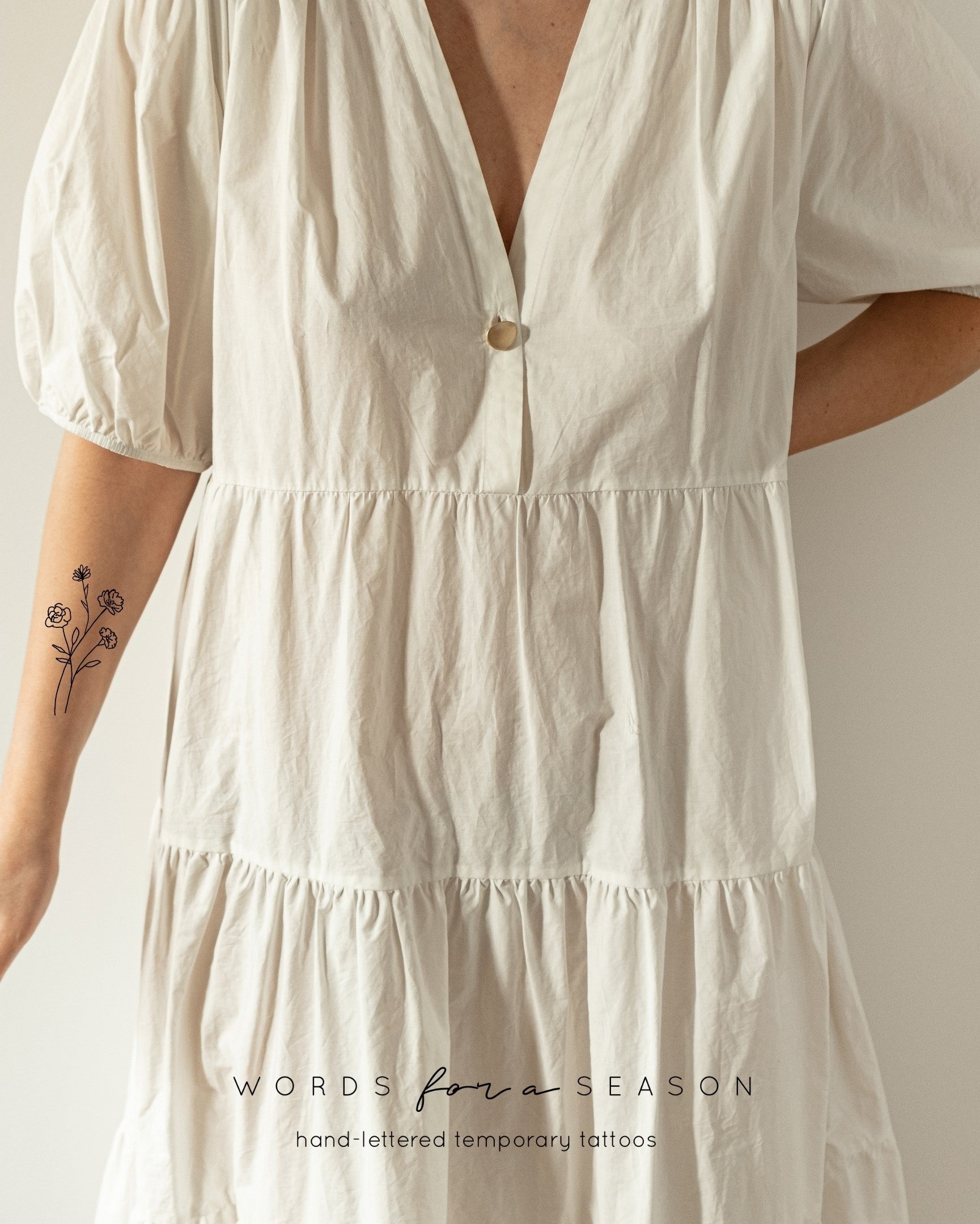 We are thrilled to offer my hand-lettering in temporary tattoos! They go on in seconds and last up to five days and are waterproof. Words for a Season, are lovely alternatives to wearing a meaningful word without the full commitment of a permanent tattoo. #wordsforaseason