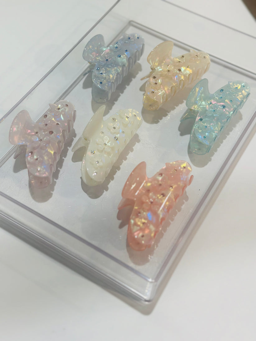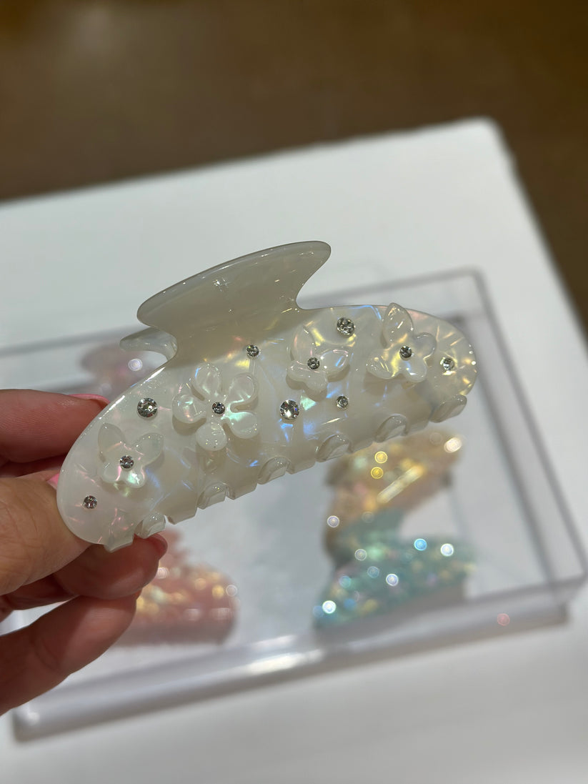 This iridescent claw clip features raised flowers and butterflies for a stylish and feminine touch. Securely hold your hair in place while adding a touch of elegance to your look. Made with high quality materials, this hair accessory is perfect for any occasion.