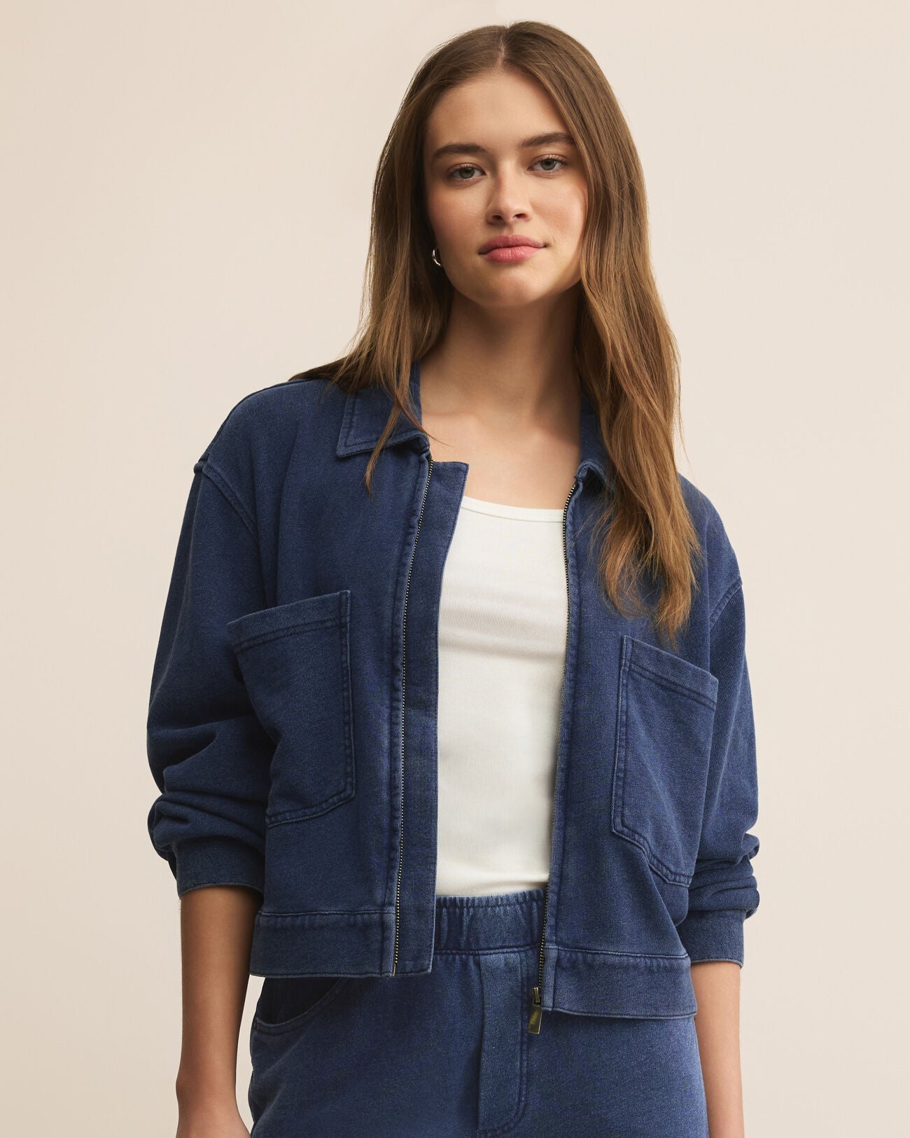 A collared, long-sleeve zip-front jacket with patch pockets, crafted in heavyweight knit denim French terry (85% cotton, 15% polyester). Treated with a heavy soft wash for a broken-in feel, this regular-fit layer offers both structure and comfort. Length from shoulder: 20 ½".