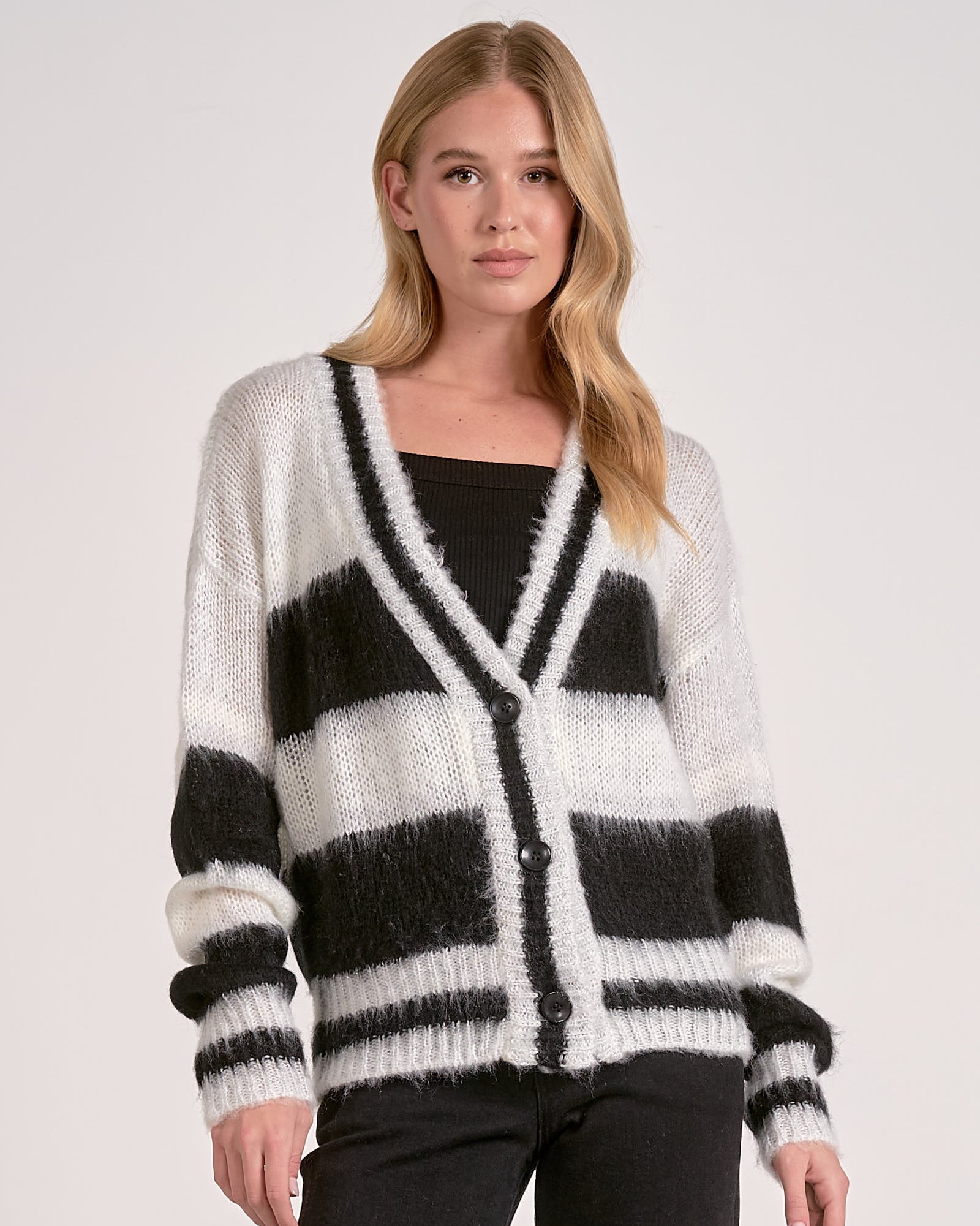 Stay cozy in this playful black and white striped cardigan, crafted from soft, fuzzy fabric for a tactile, comfy feel. With a relaxed fit and versatile design, it’s perfect for layering over tees, tanks, or dresses for effortless, casual-chic style.