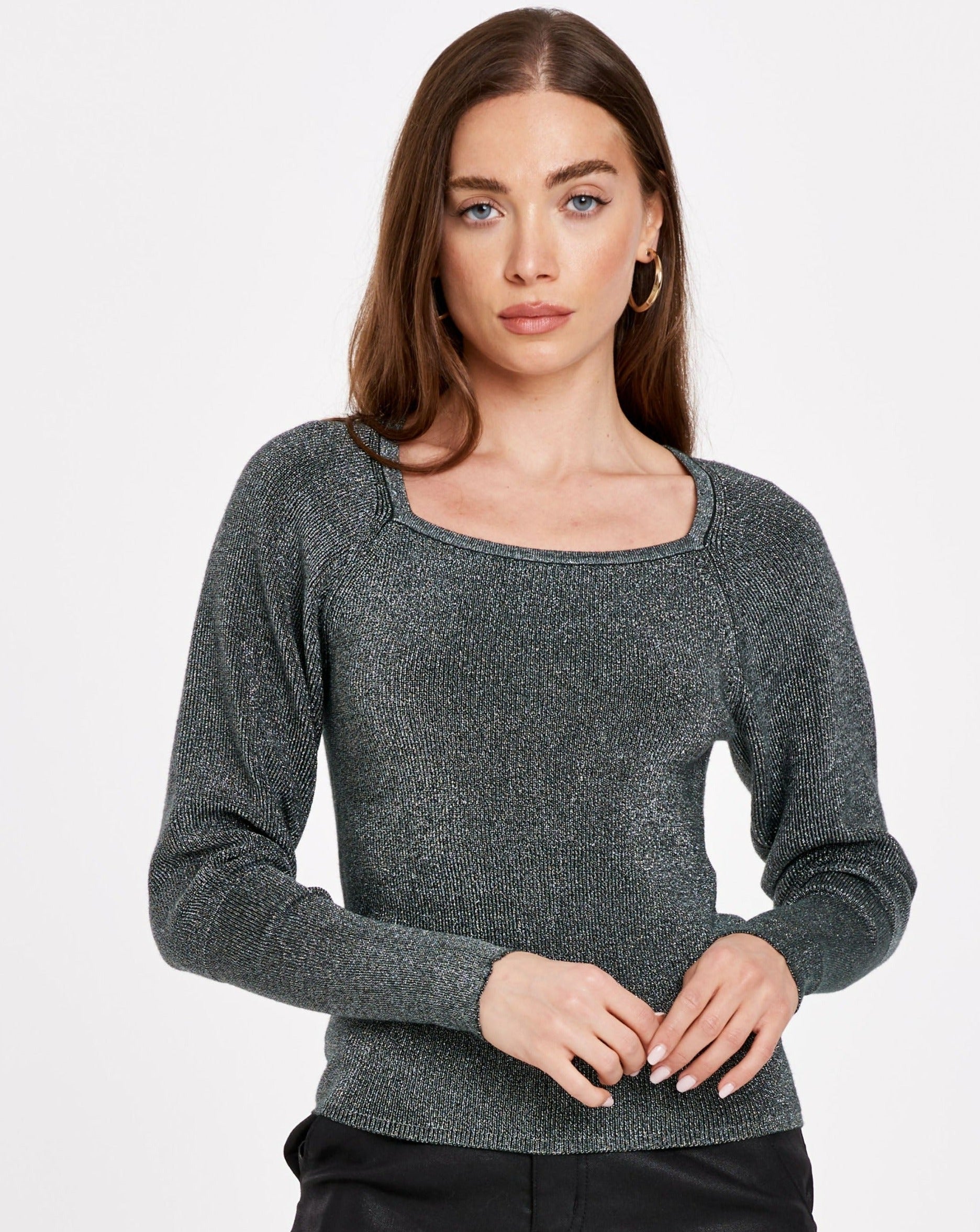 Long cuff puff sleeve top, square neck with raglan armhole seams in luxurious metalic lurex fiber shine. GLAM! The spotlight while versatile for any lifestyle... Solid color yarn fitted.