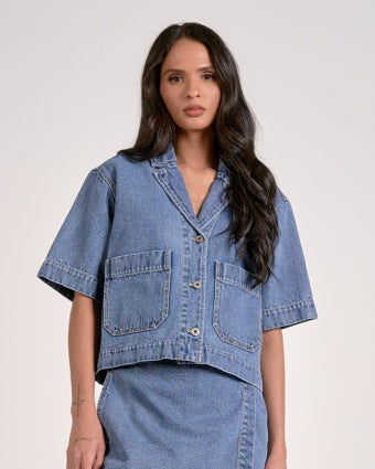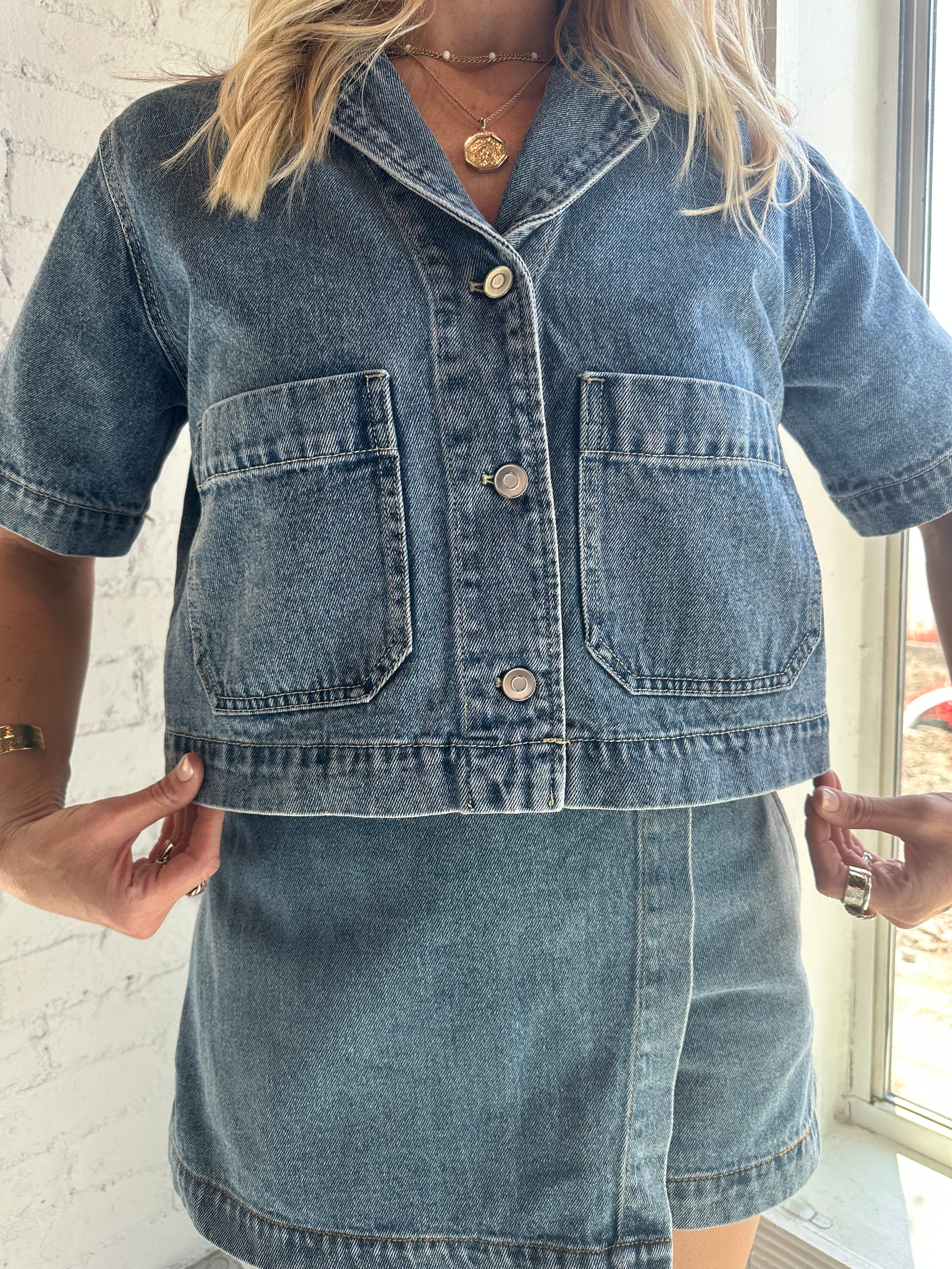 A fresh twist on a timeless classic. This cropped denim button-up features a front button closure, classic collar, and relaxed silhouette that hits just right at the waist. Perfect with high-rise bottoms, layered over a tank, or worn on its own for an effortless statement. And yes—it pairs seamlessly with our matching Lexi denim skort for a head-turning set.