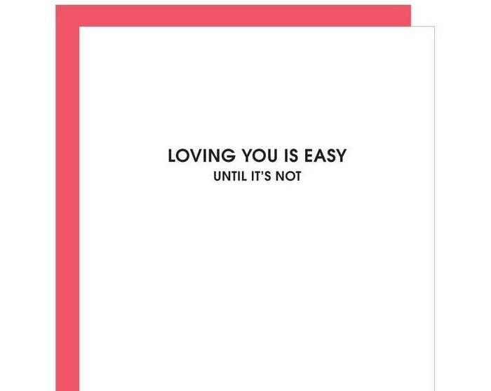 Loving you is easy until it's not" Card is a letterpress printed on a vintage printing press.