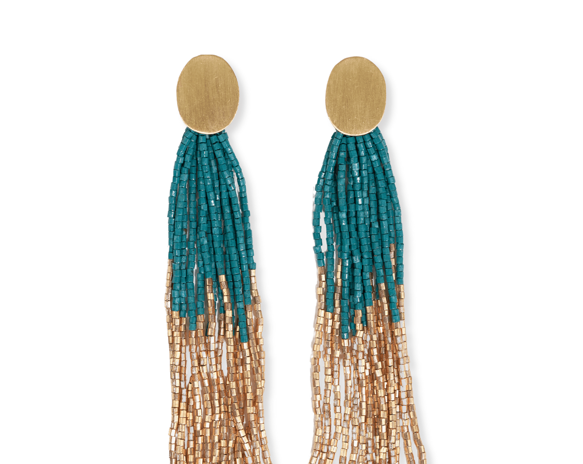 Mae Oval Brass Post 2-Color Beaded Tassel Earrings are elegant post earrings made with precision-cut luxe glass beads. They feature a bright + boho teal color and are crafted from brass and glass materials. Perfect for both casual and formal occasions, they bring a pop of color and a hint of bohemian flair to any outfit. Let your style be BOLD and make a statement with these exquisite and enchanting earrings.