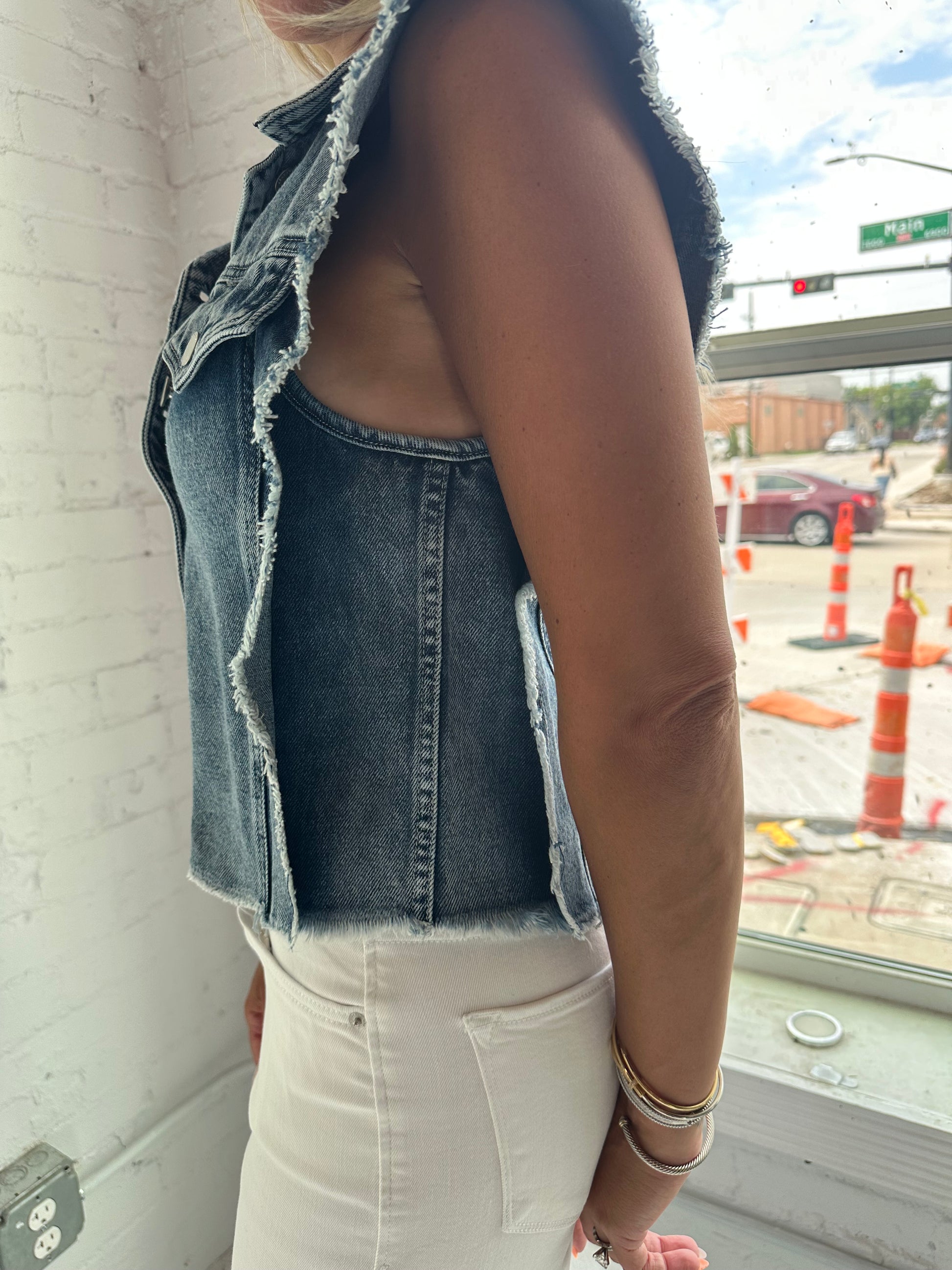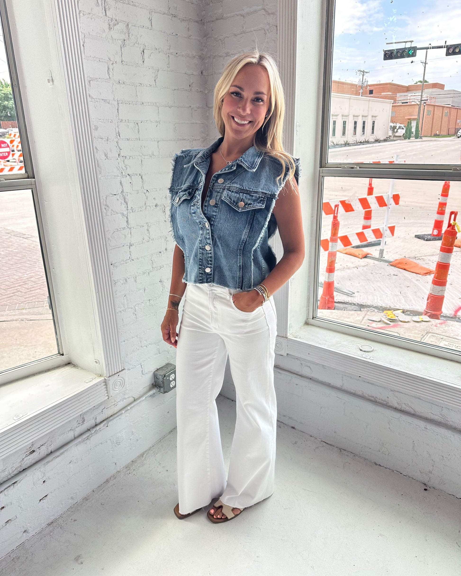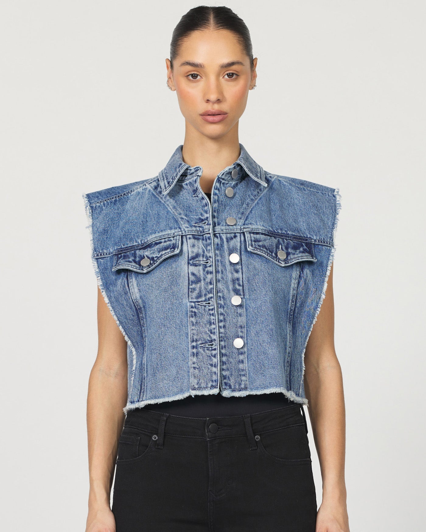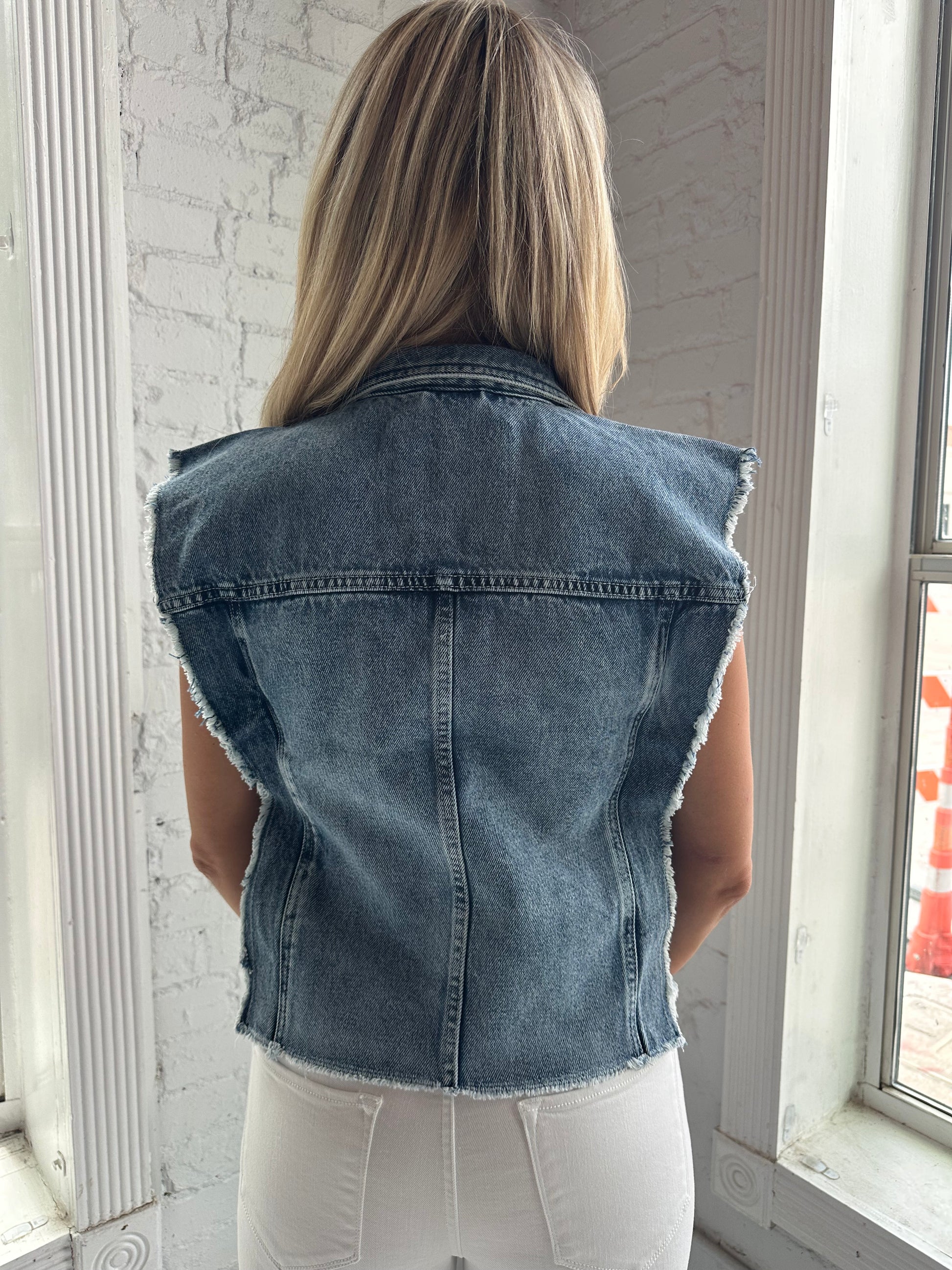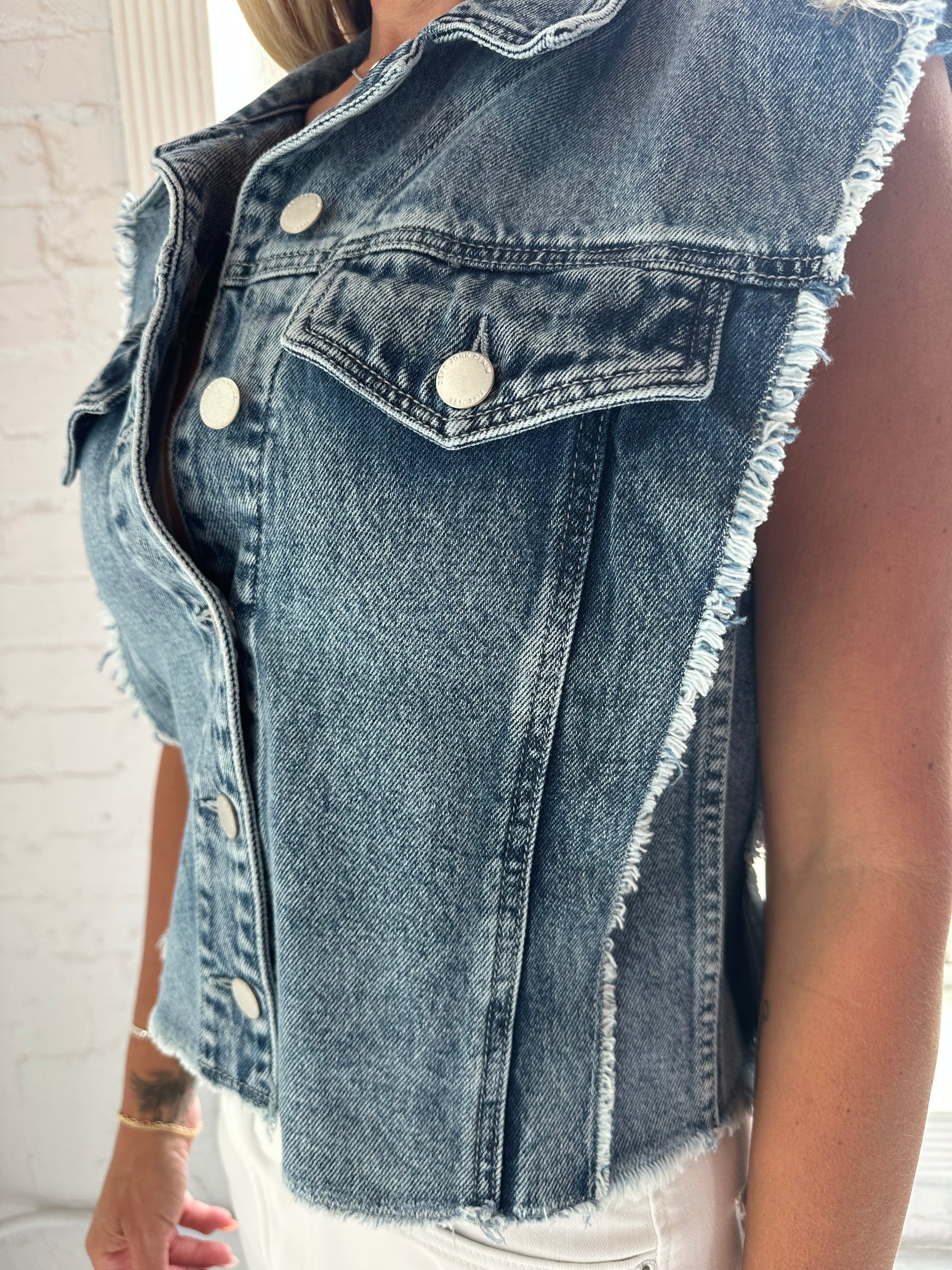 Add an effortlessly cool layer to your look with the Melody Button Denim Vest. Featuring a classic medium-wash denim with a slightly cropped fit, this sleeveless vest stands out with raw frayed edges for a laid-back vibe. Complete with functional silver snap buttons and chest pockets, it’s perfect for pairing over a tank, graphic tee, or wearing solo for a bold statement.