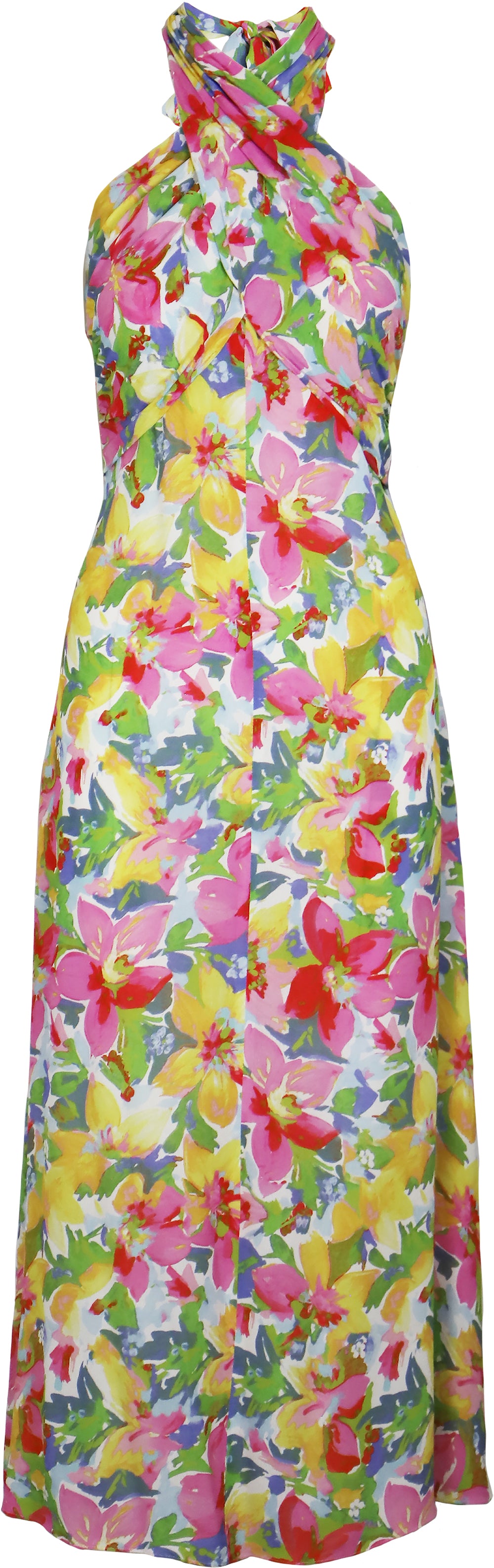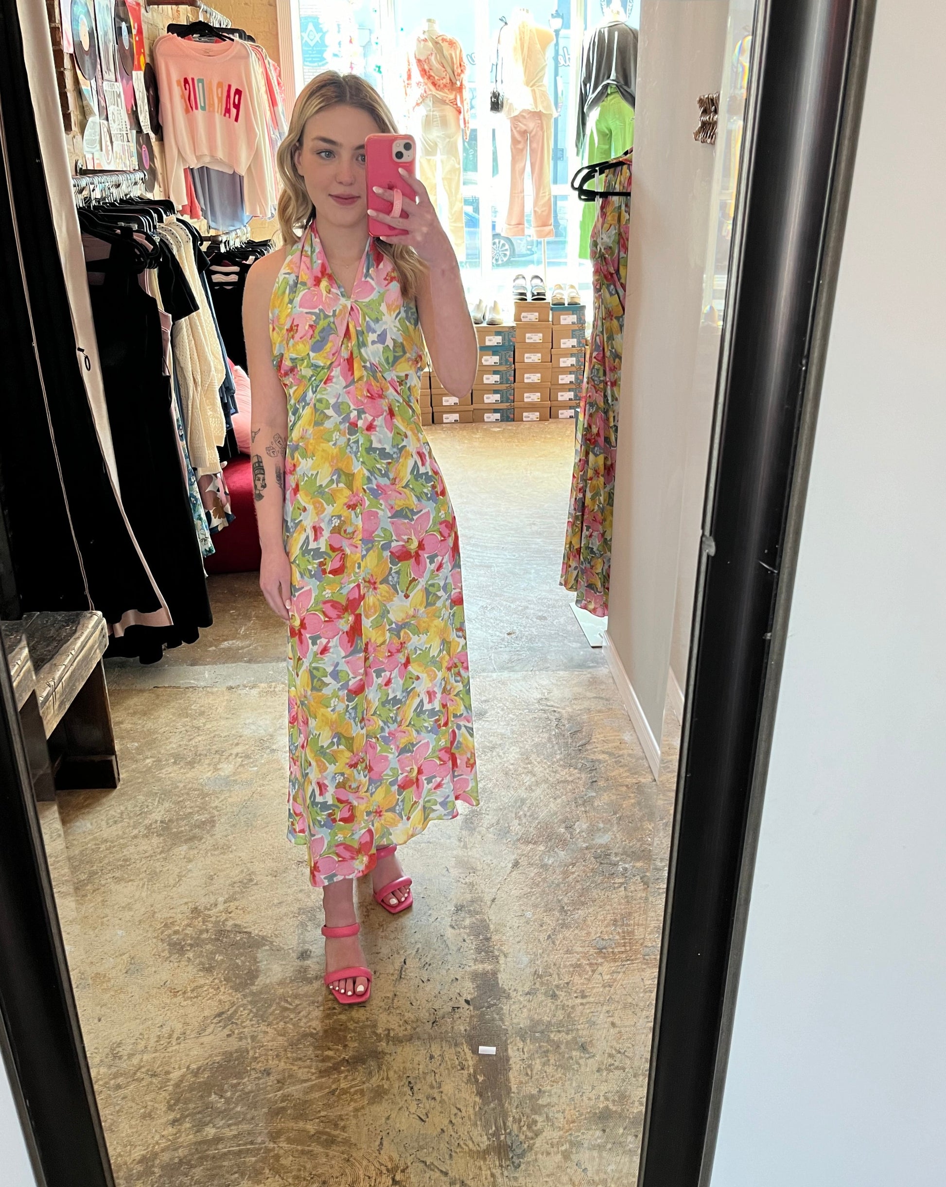 This stunning halter neck dress with a vibrant floral print embodies elegance and femininity. The halter neckline gracefully accentuates the shoulders and neckline, adding a touch of sophistication to any occasion. The vibrant floral print, delicately spread across the fabric, brings a burst of color and life to the ensemble, making it perfect for both daytime events and evening soirees!
