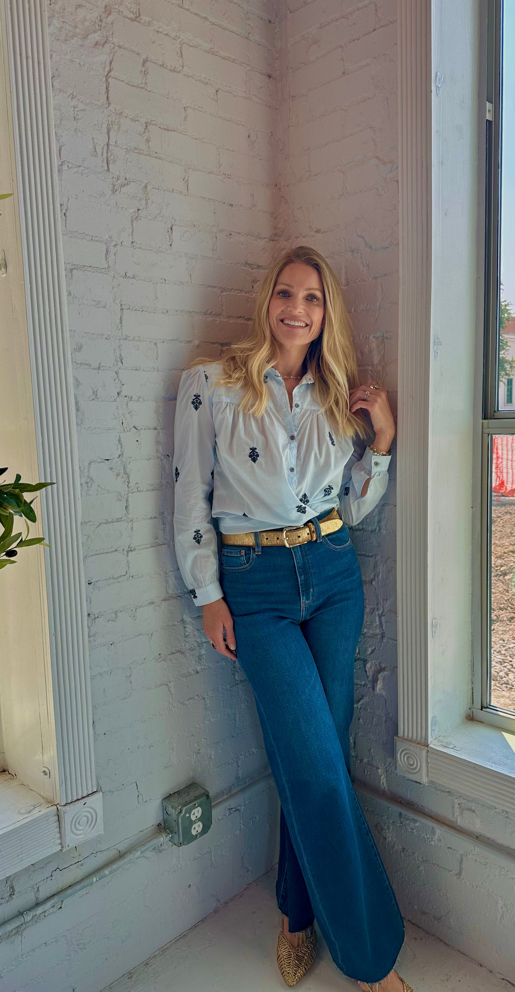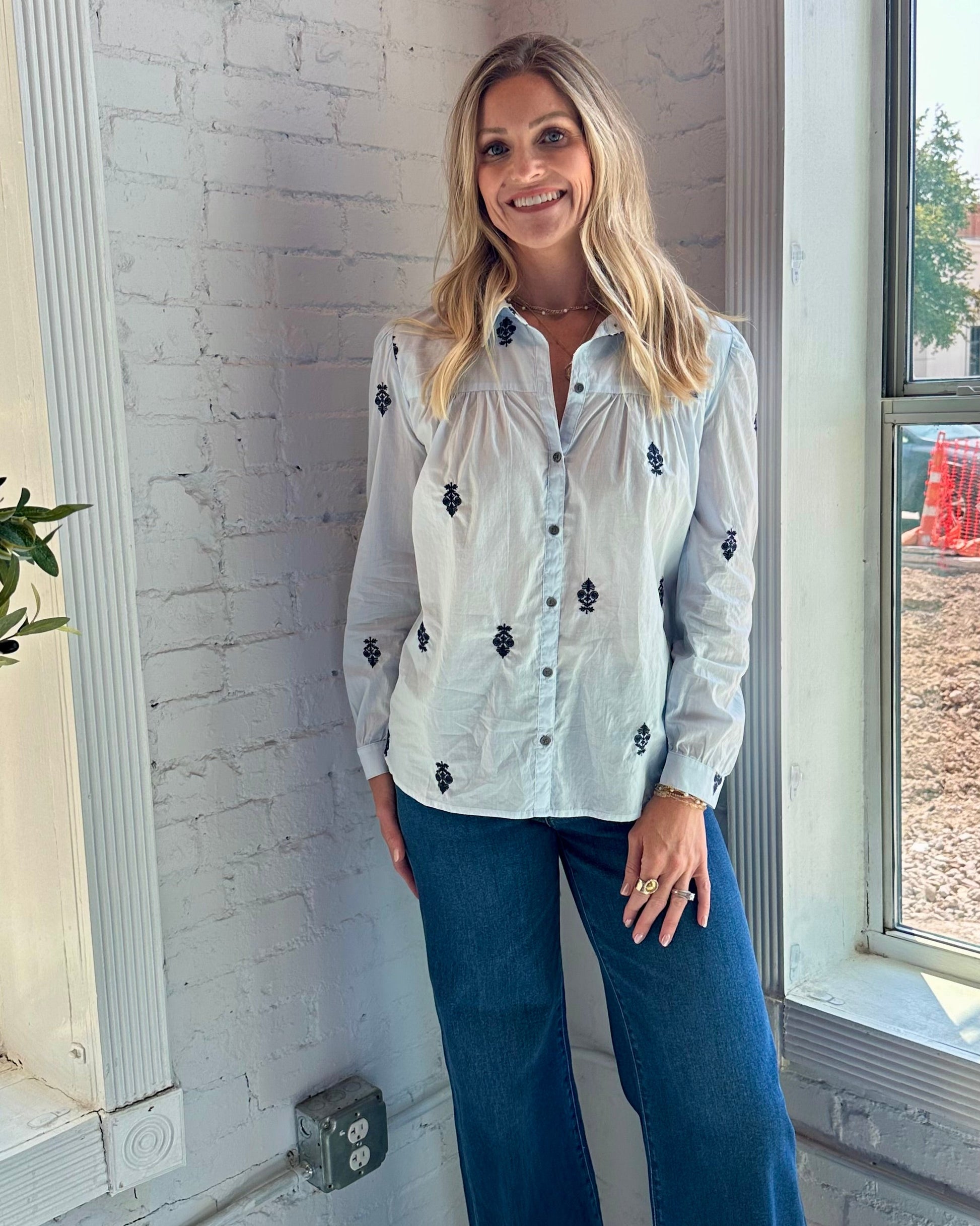 Elevate your everyday style with the Nasrin Shirt — a timeless button-down with a feminine twist. This crisp light blue blouse features intricate navy embroidery throughout, adding texture and charm. Designed with subtle puffed sleeves, gathered detailing at the shoulders, and a relaxed fit, it effortlessly blends classic tailoring with soft elegance. Pair it with denim for a casual look or tuck it into trousers for an office-ready ensemble.