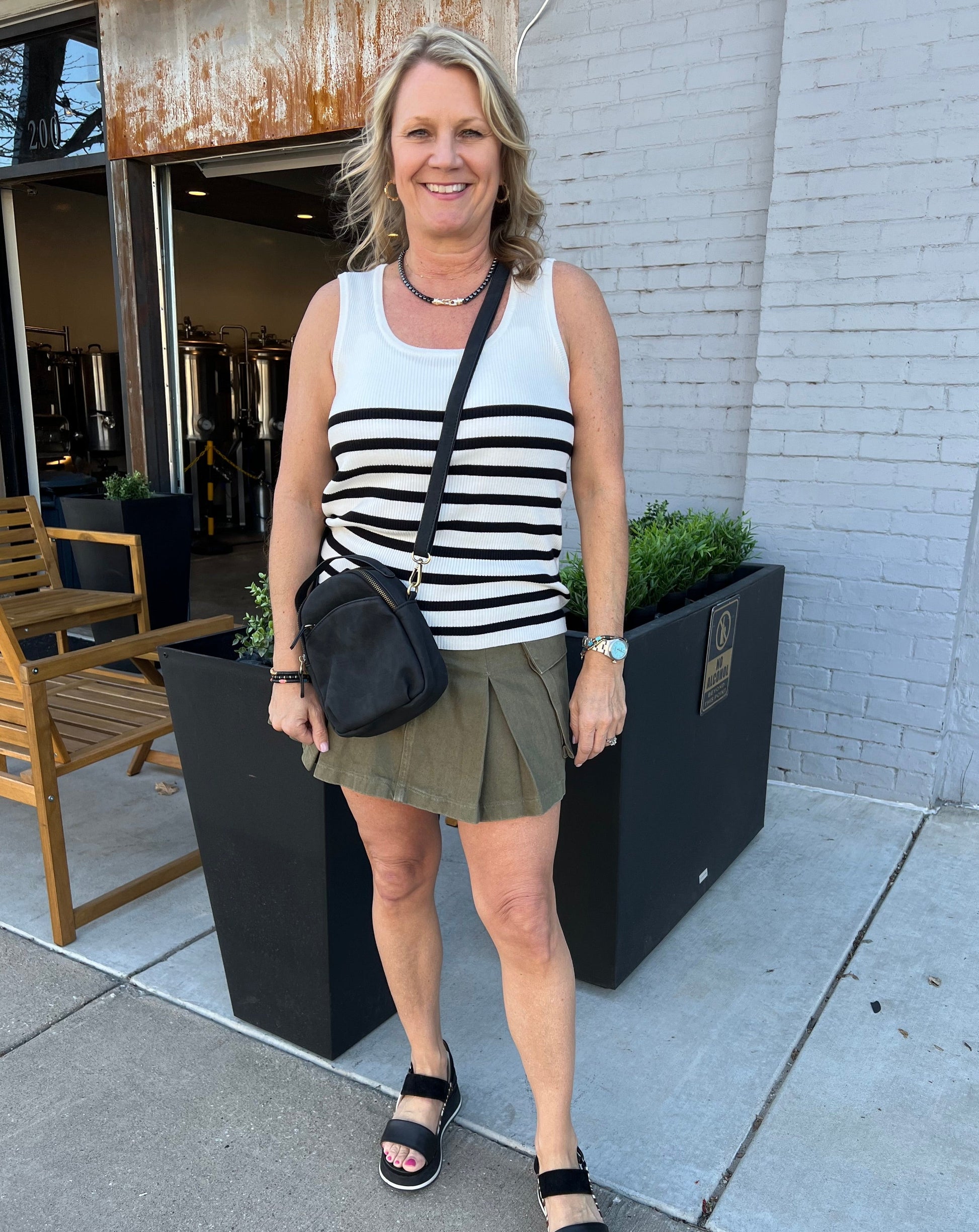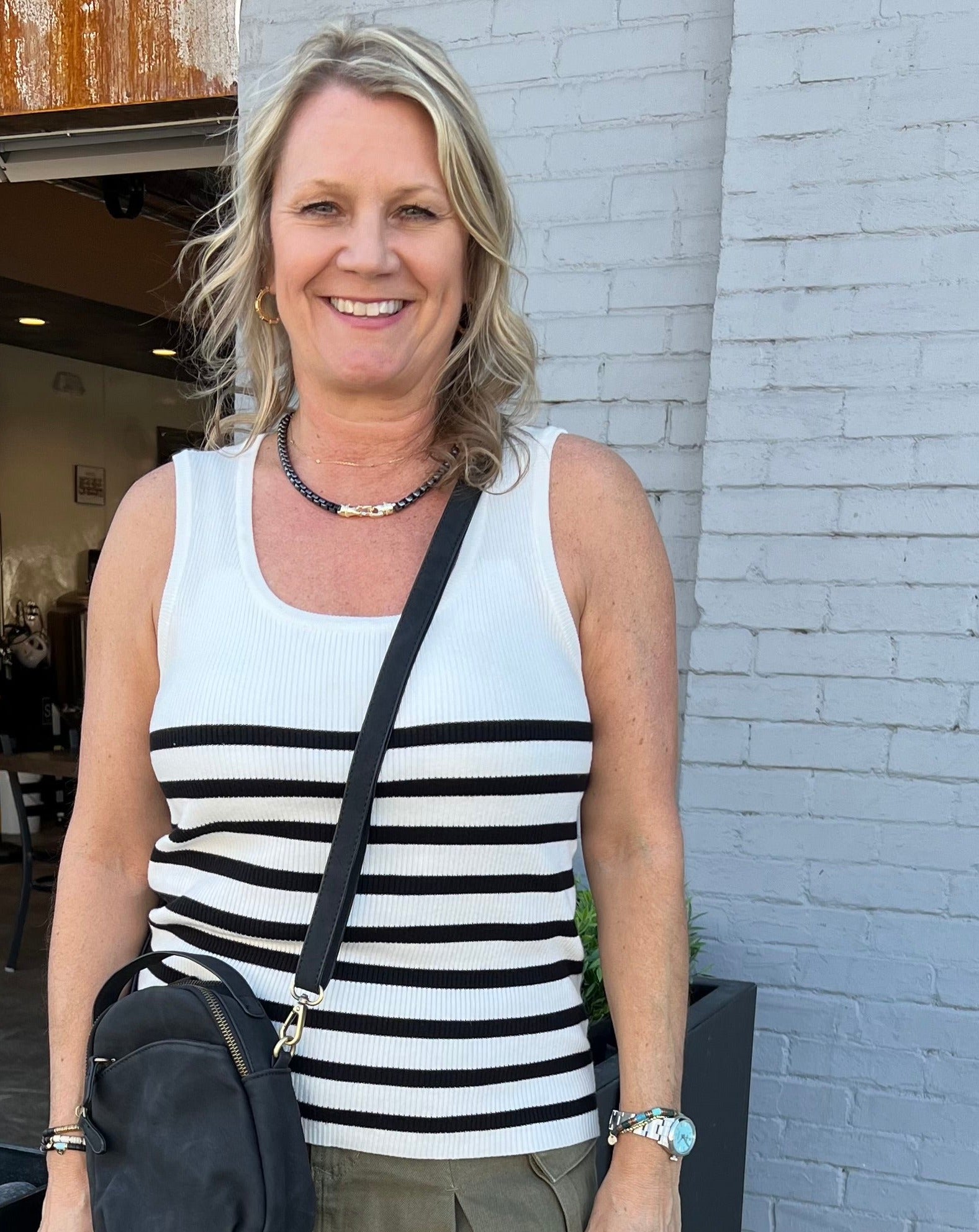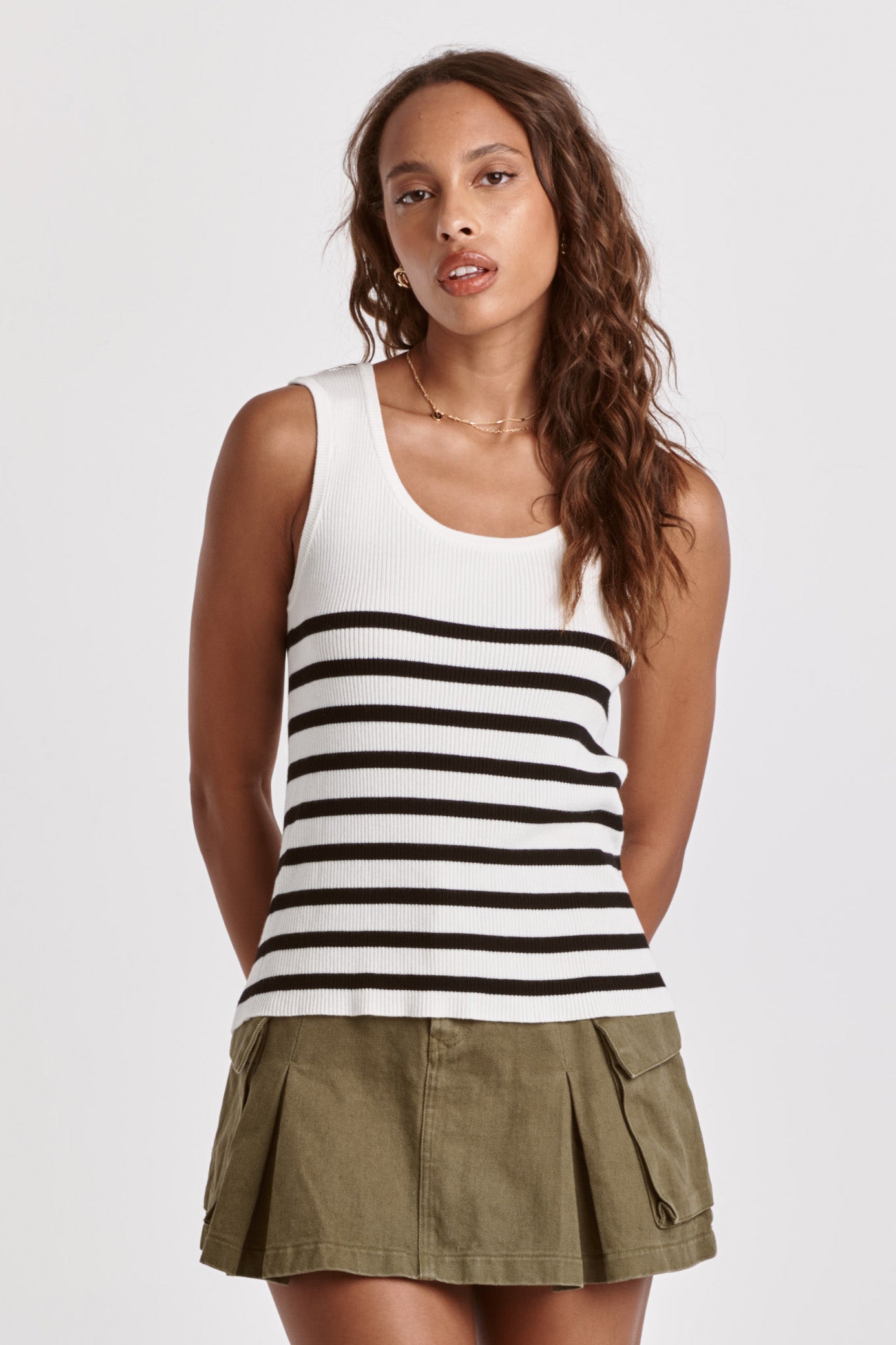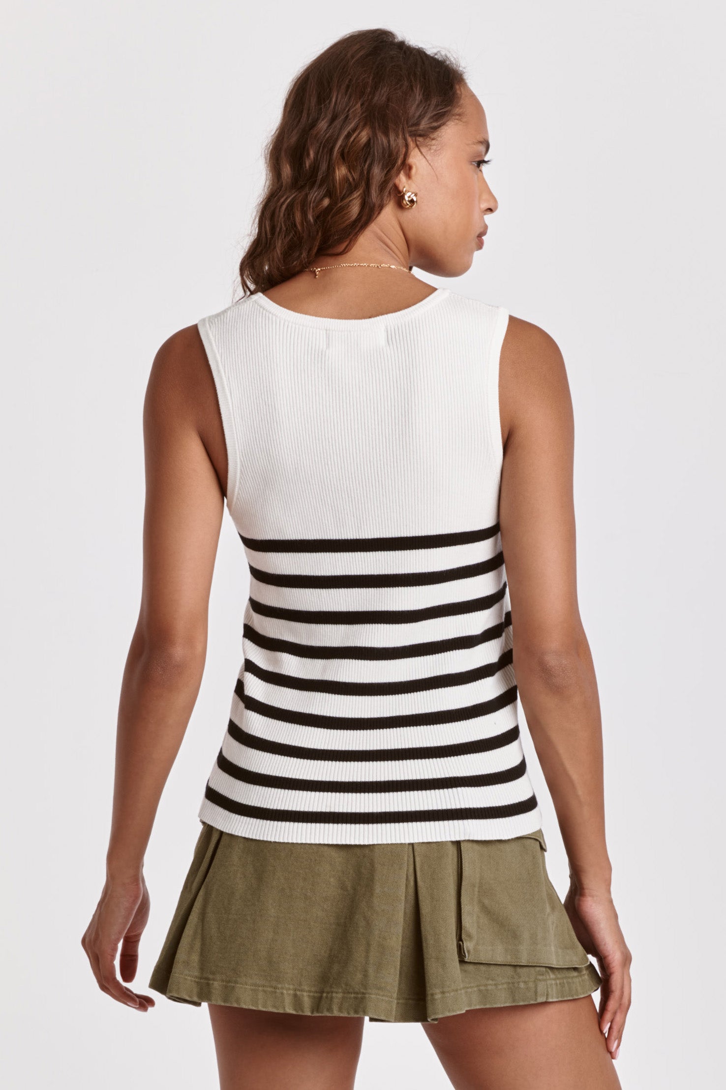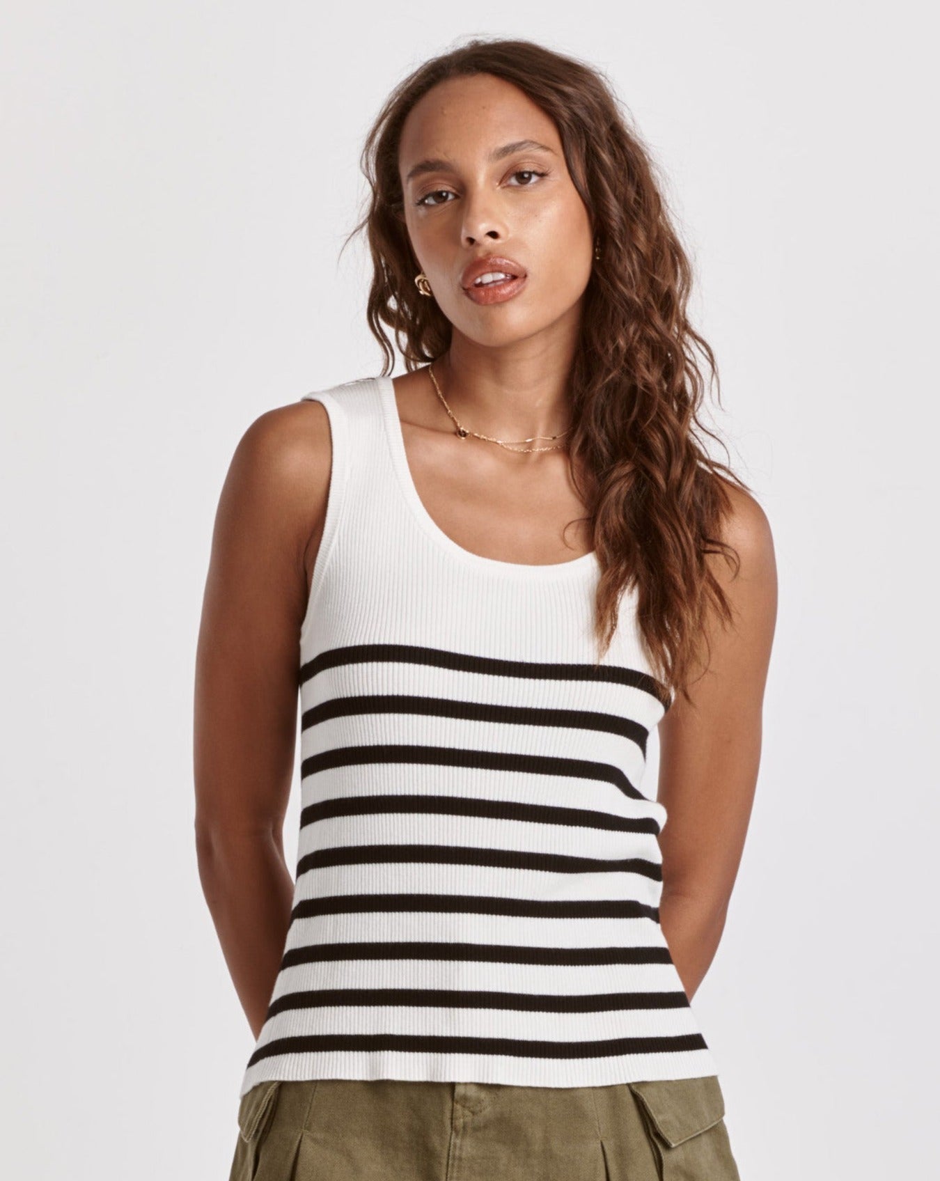 Scoop neck tank, yarn knit finished engineered white stripe repeats. Stripe yarn fitted. Seamless blends of comfort & details, embrace the classic stripe sophistication of this knit essential.