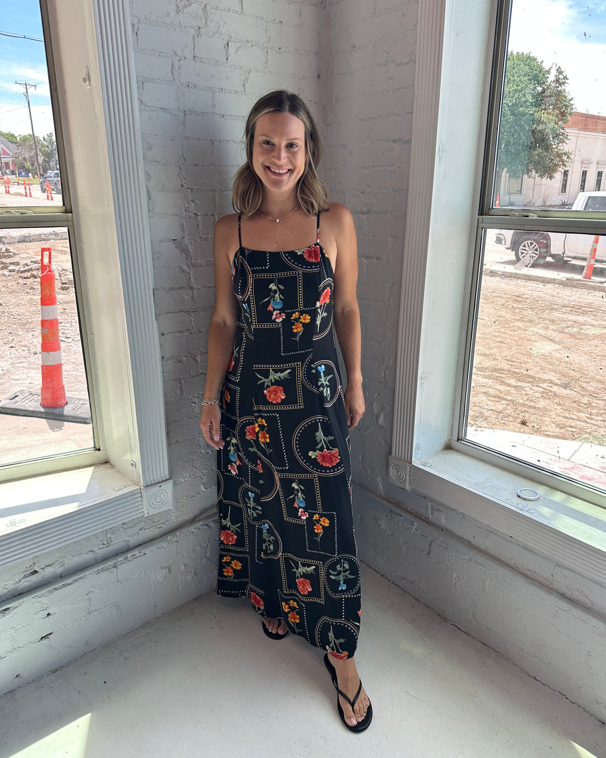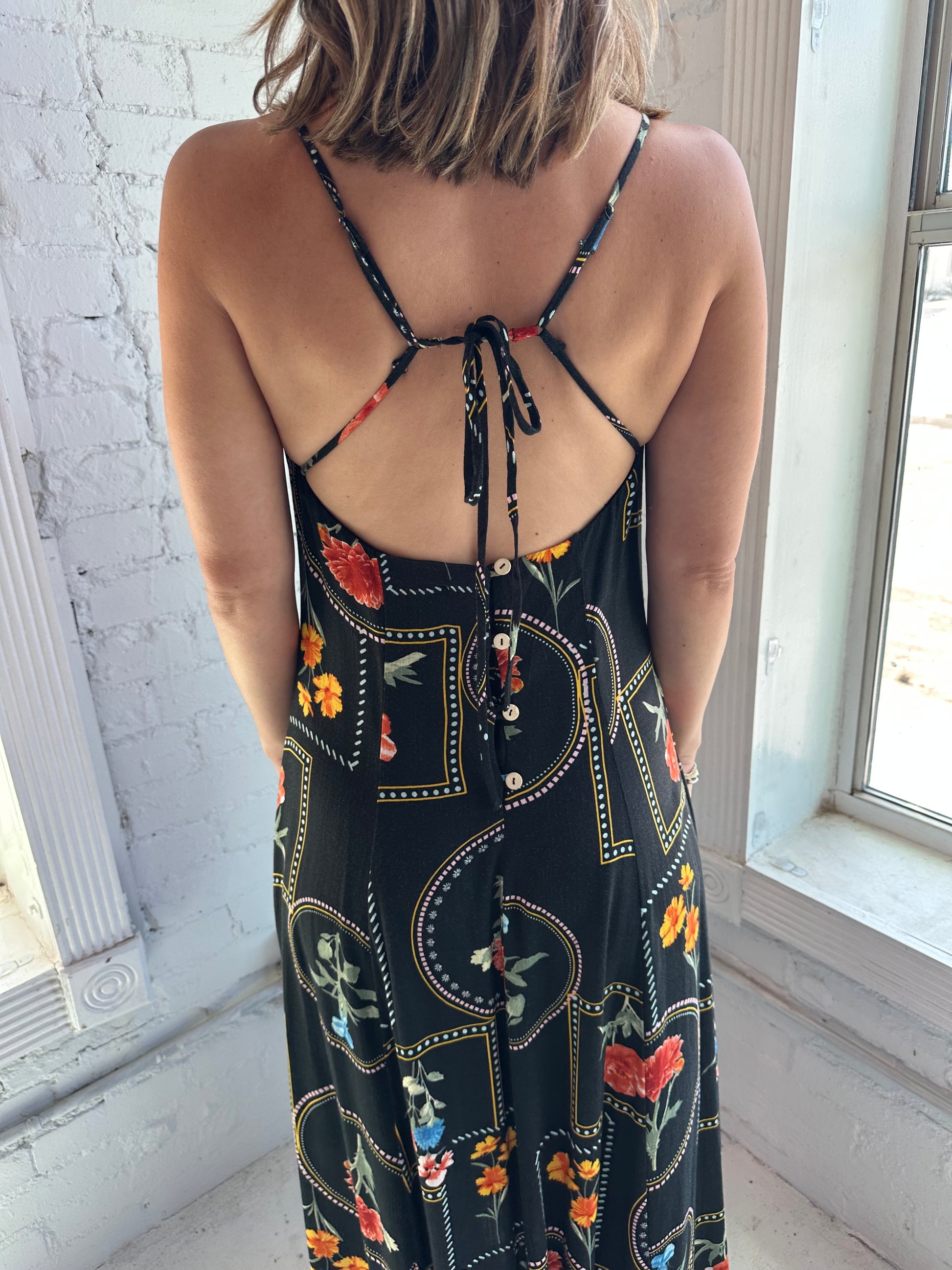 This strappy, A-line midi dress features a striking floral block print over a deep, moody background. With a square neckline, adjustable thin straps, and a relaxed silhouette that flows with every step, it’s perfect for warm-weather days or your next getaway. Pair it with sandals and a sunhat for that effortless boho vibe.