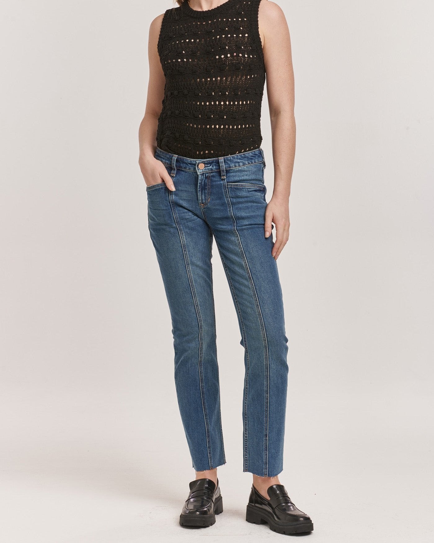 Mid rise slim straight leg jeans. It's the perfect fit for your hips and thighs, hugging you in all the right places, and resting just below your waist. Full inseam on comfort stretch denim accented with hand sanding hip & knee whiskers, inseam chevrons, random abrasions & grindings, cut-off hem details.