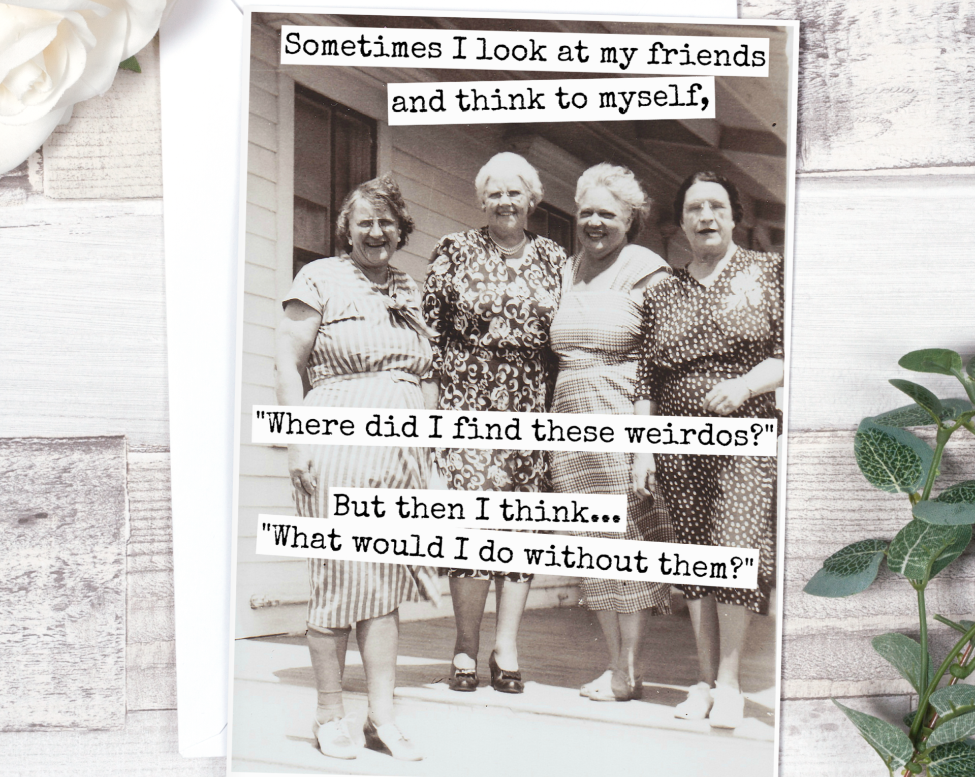 The best card to give to your very best friends " Sometimes I look at my friends and think to myself, Where did I find These weirdos? But then I think... What would I do without them?"