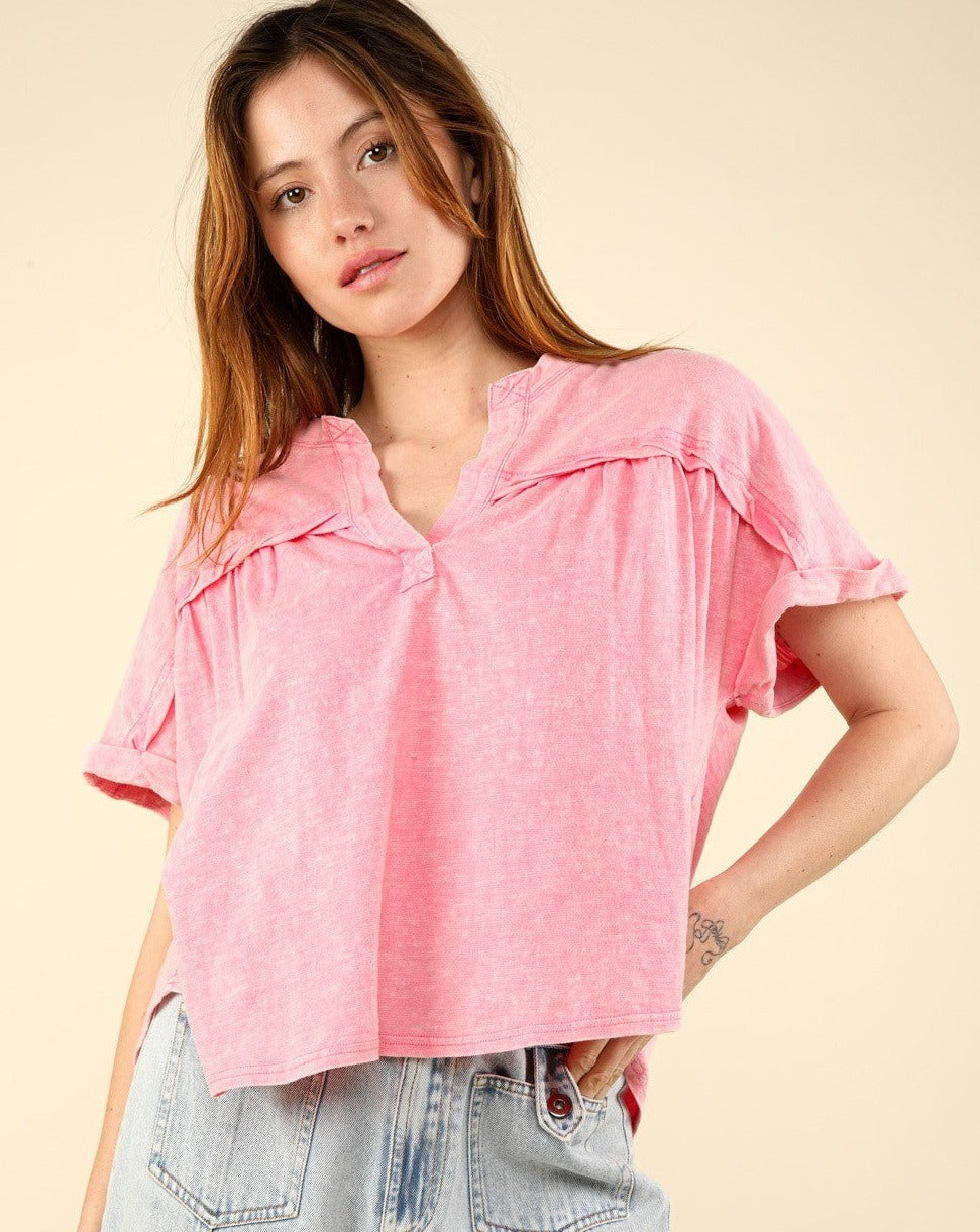 Unleash your inner girly self with our Split Neck Washed Knit Top! The short folded sleeves and raw edge shirring detail add a touch of edge to the pink hue. With a causal fit, this top makes styling effortlessly easy. Who says you can't have fun with fashion?!