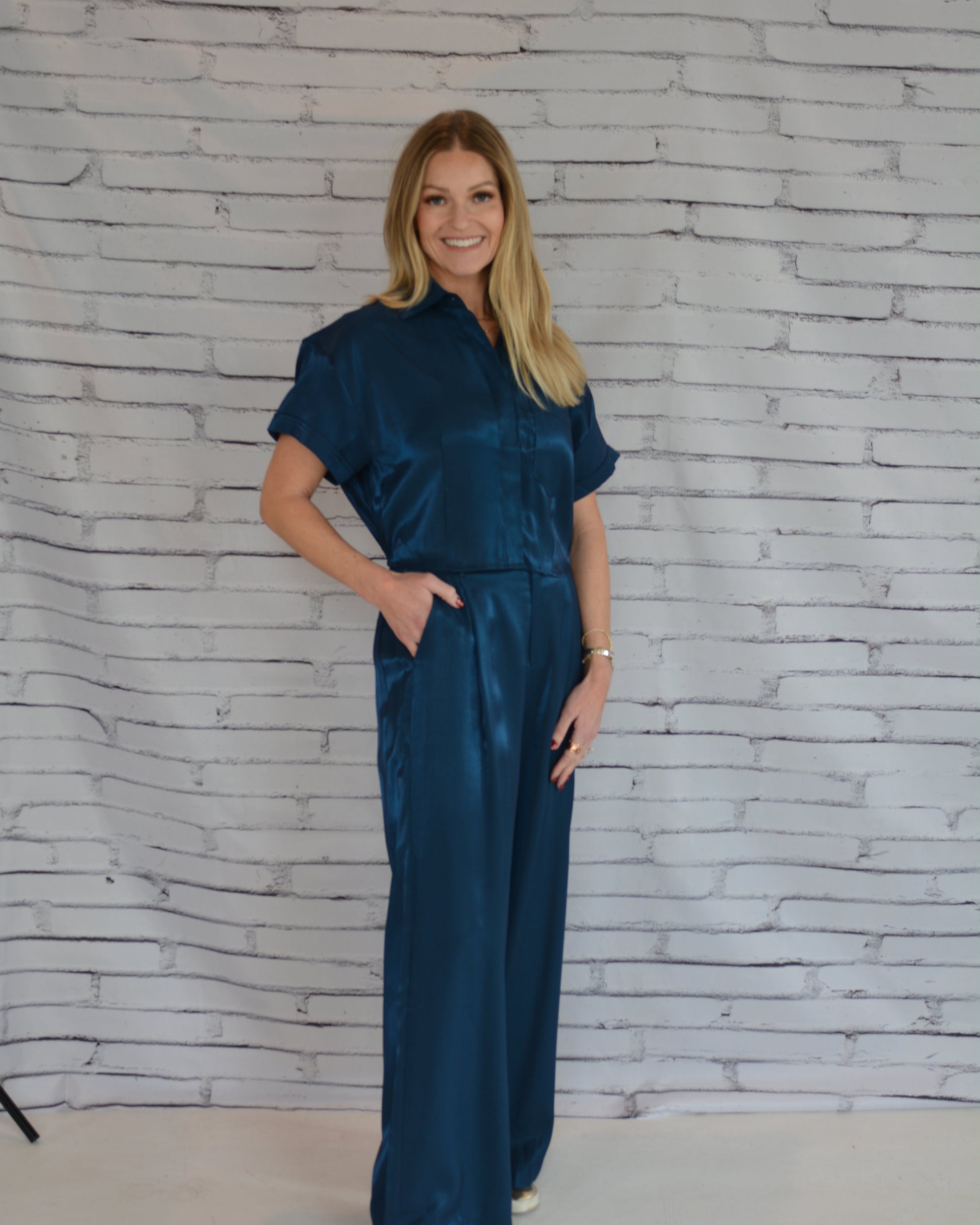 The Collar Neck Short-Sleeve Crop Shirt is designed to complement the High Waist Tailored Wide Pants for a perfectly coordinated look. Featuring a structured collar neckline and clean short sleeves, this cropped silhouette balances modern tailoring with effortless ease. Crafted in a rich navy tone, it offers a refined yet contemporary finish. Wear it as a matching set for a sleek, fashion-forward statement, or style it separately for versatile, everyday elegance.