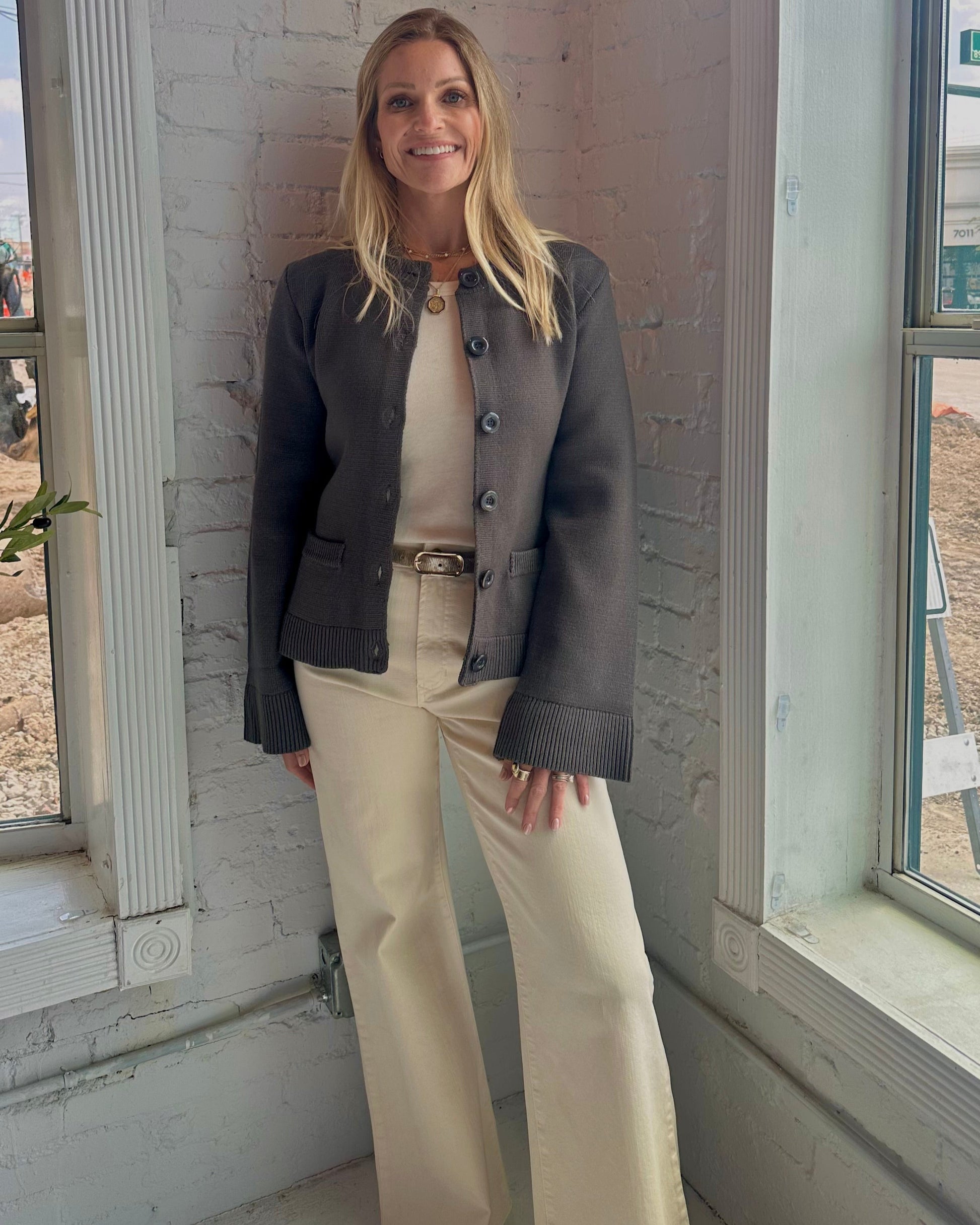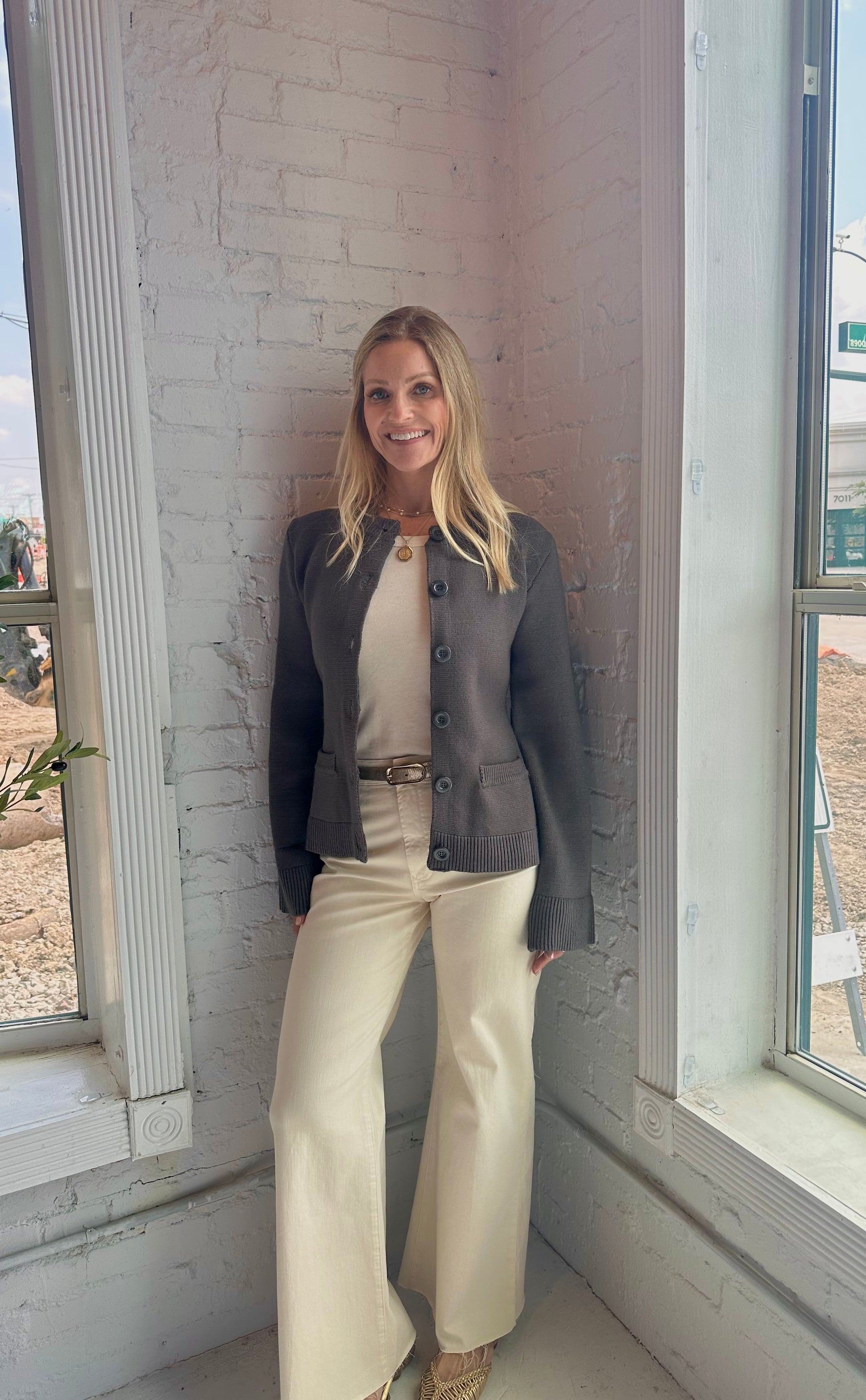The perfect blend of polish and comfort—this black button-up cardigan features a soft knit texture, structured silhouette, and subtle front pockets. Ideal for layering over blouses or wearing solo for a clean, classic look.