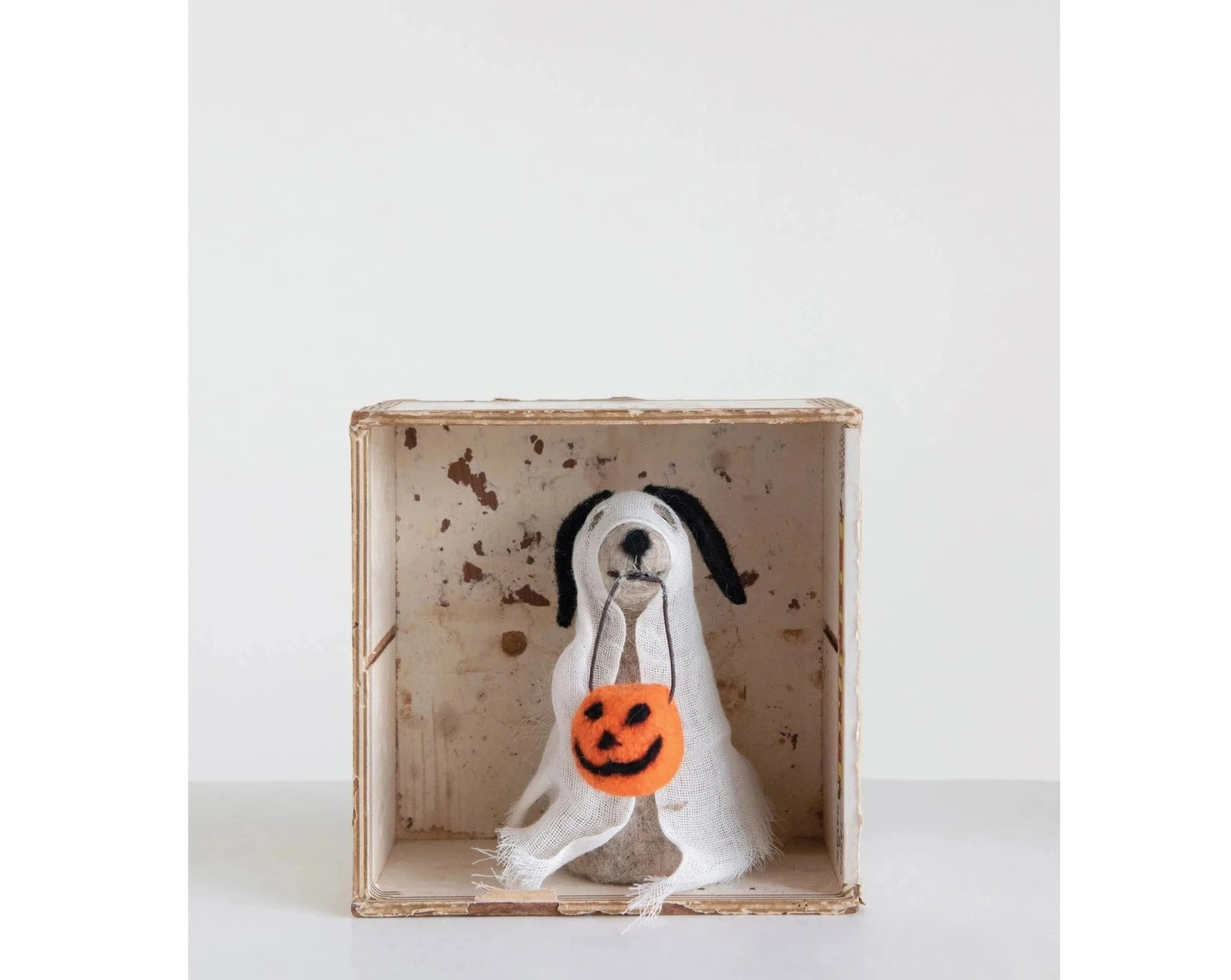 Wool Felt Dog in Ghost Costume with a pumpkin trick or treat bucket!
